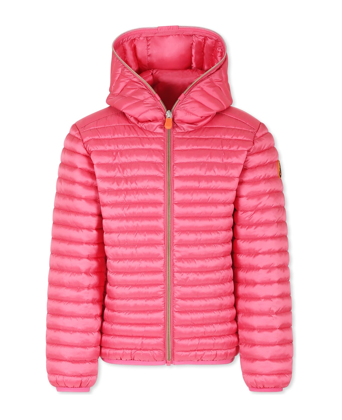 Fuchsia 100 gram down jacket, long sleeves, with hood, front zip fastening, side zip pockets, elasticated cuffs and hem. It is embellished with orange rubberized iconic logo on the sleeve; it is padded with Plumtech, a synthetic thermal wadding, made with respect for the environment and animals; it is breathable and retains heat.