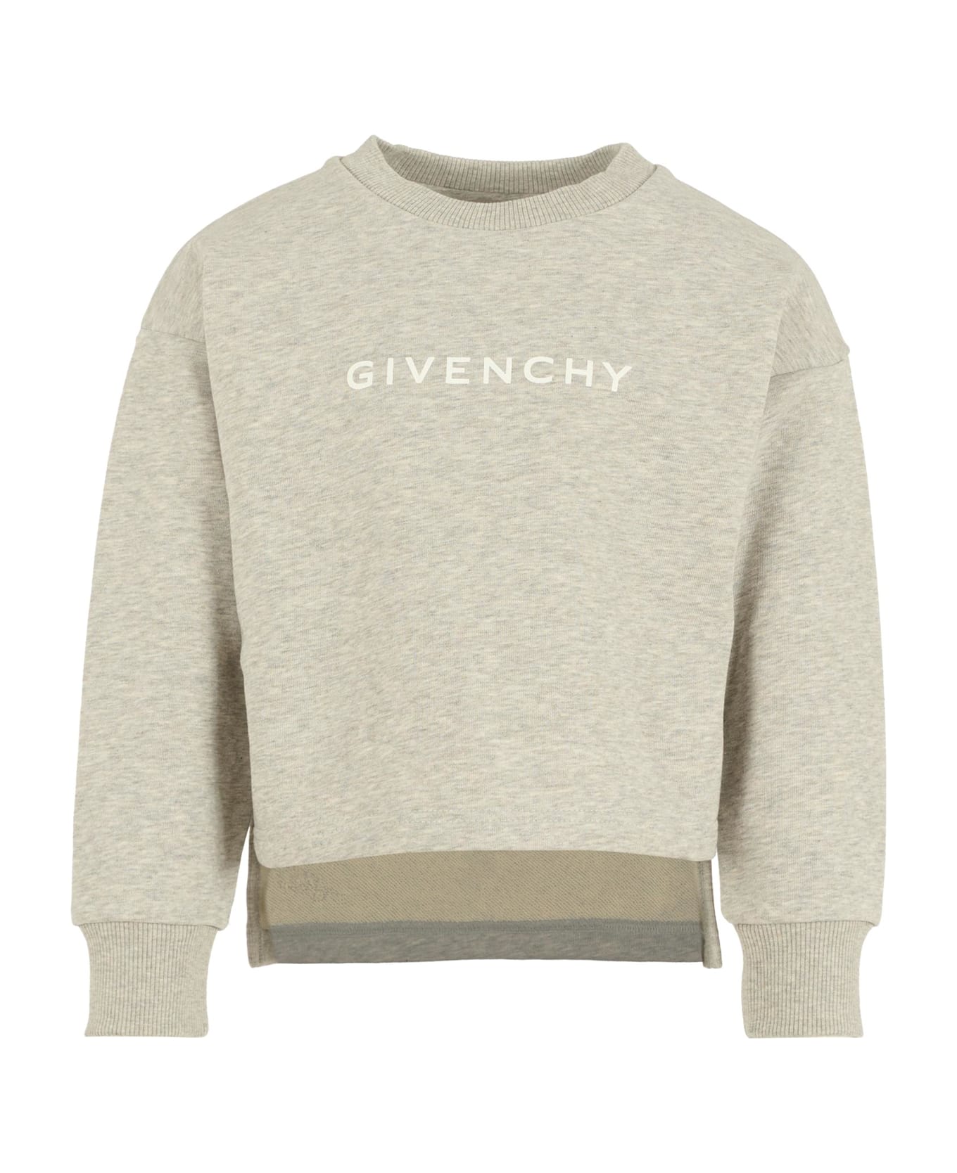 Grey sweatshirt from luxury brand Givenchy Kids, made of a lightly brushed organic cotton blend. It features long sleeves, a ribbed crew neck and cuffs, an asymmetric hem, and side slits. It is embellished with a logo print on the front and an iconic 4G motif on the back.