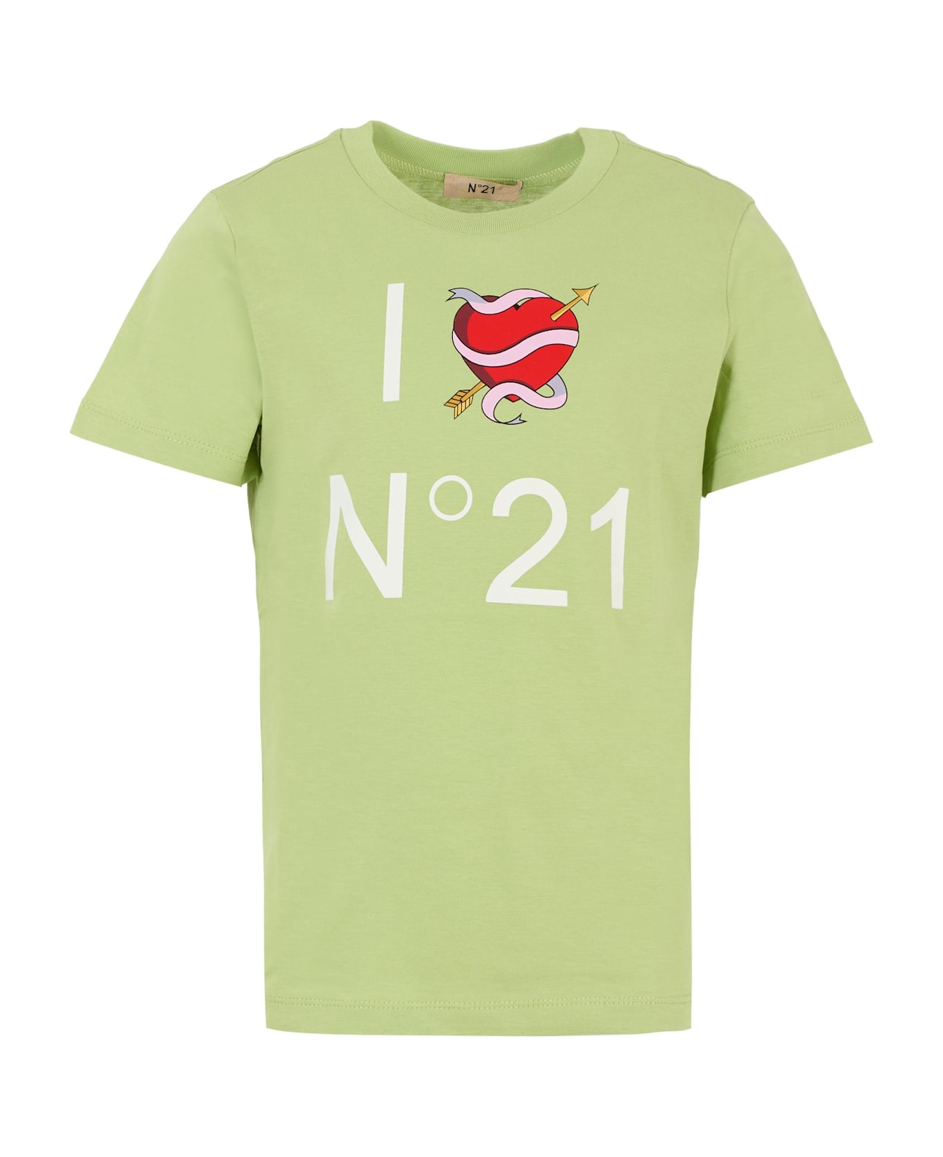 Green cotton t-shirt, with short sleeves and a ribbed crew neck. It is embellished with a red heart print and logo on the front.
