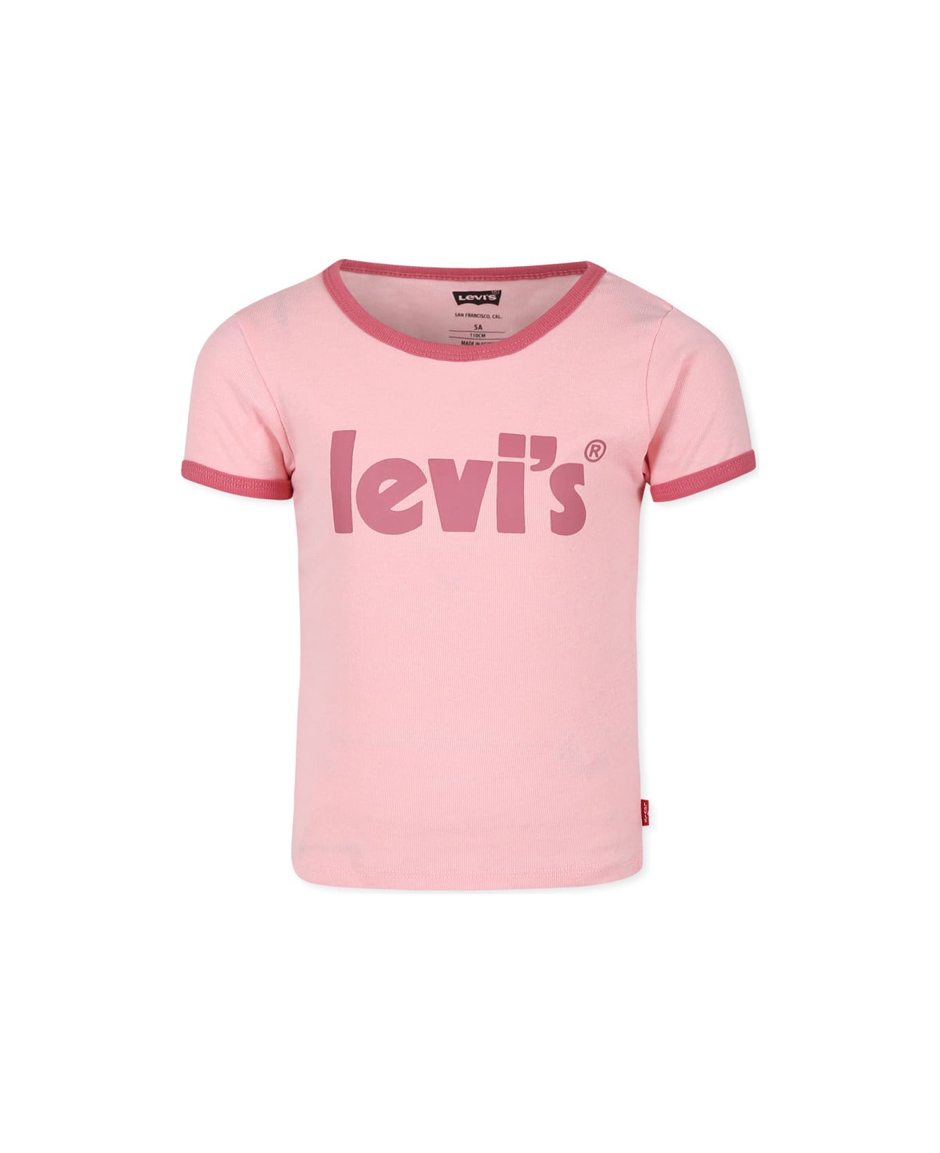 Pink cotton T-shirt with short sleeves, crew neck and fuchsia ribbed hem. It is embellished with fuchsia printed logo on the front and red logo patch on the side.