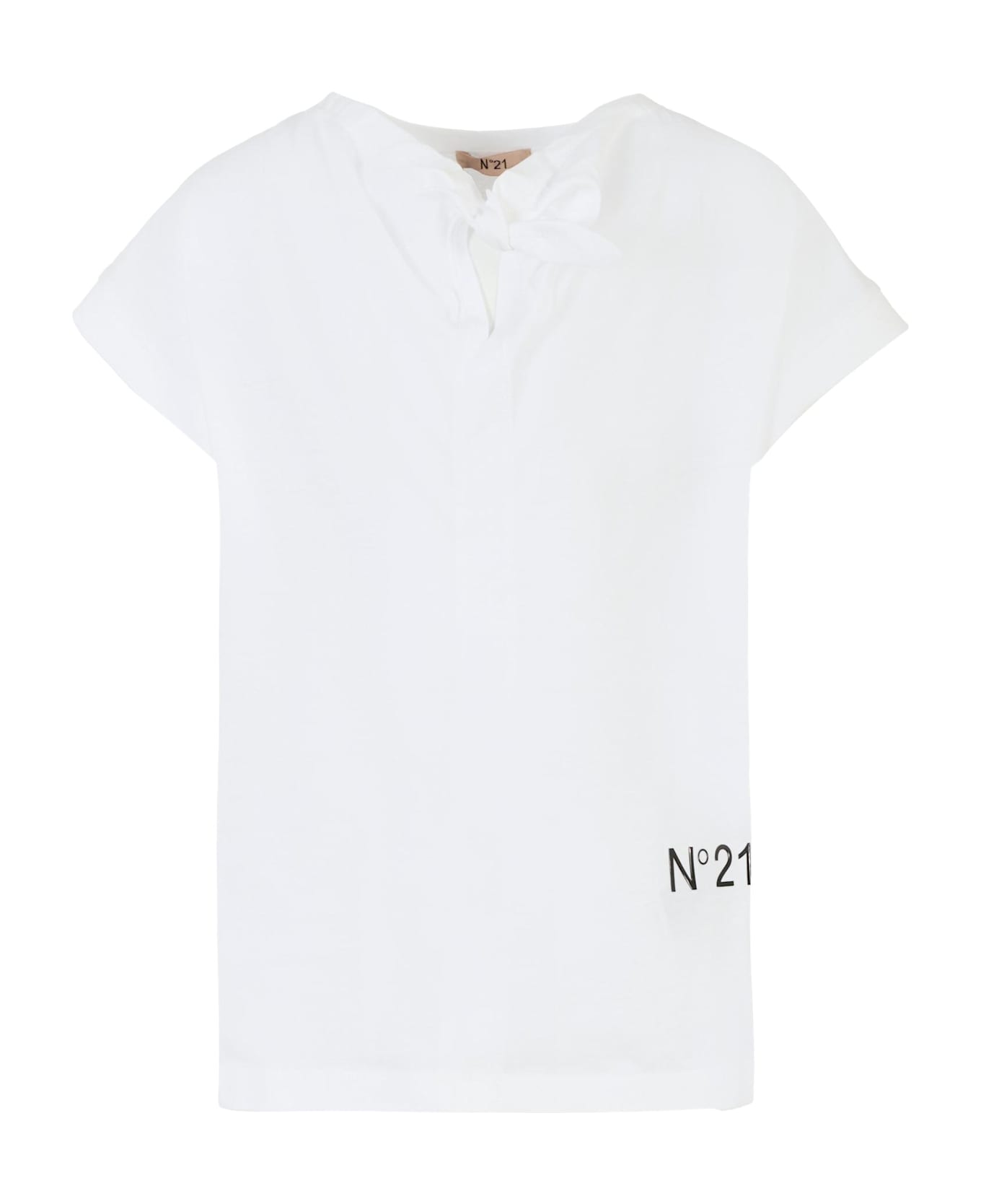 White cotton t-shirt with short sleeves, a round neckline, and a knot at the front. It is embellished with a black rubberized logo on the front.