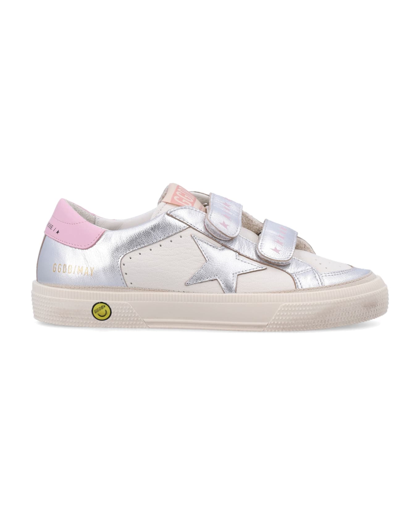 May School Sneakers By Golden Goose Kids. Featuring: Leather Upper With Metallic Finish Double Velcro Closure Iconic Star Patch On The Side Contrasting Pink Heel Tab Rubber Sole With Vintage Effect Padded Interior