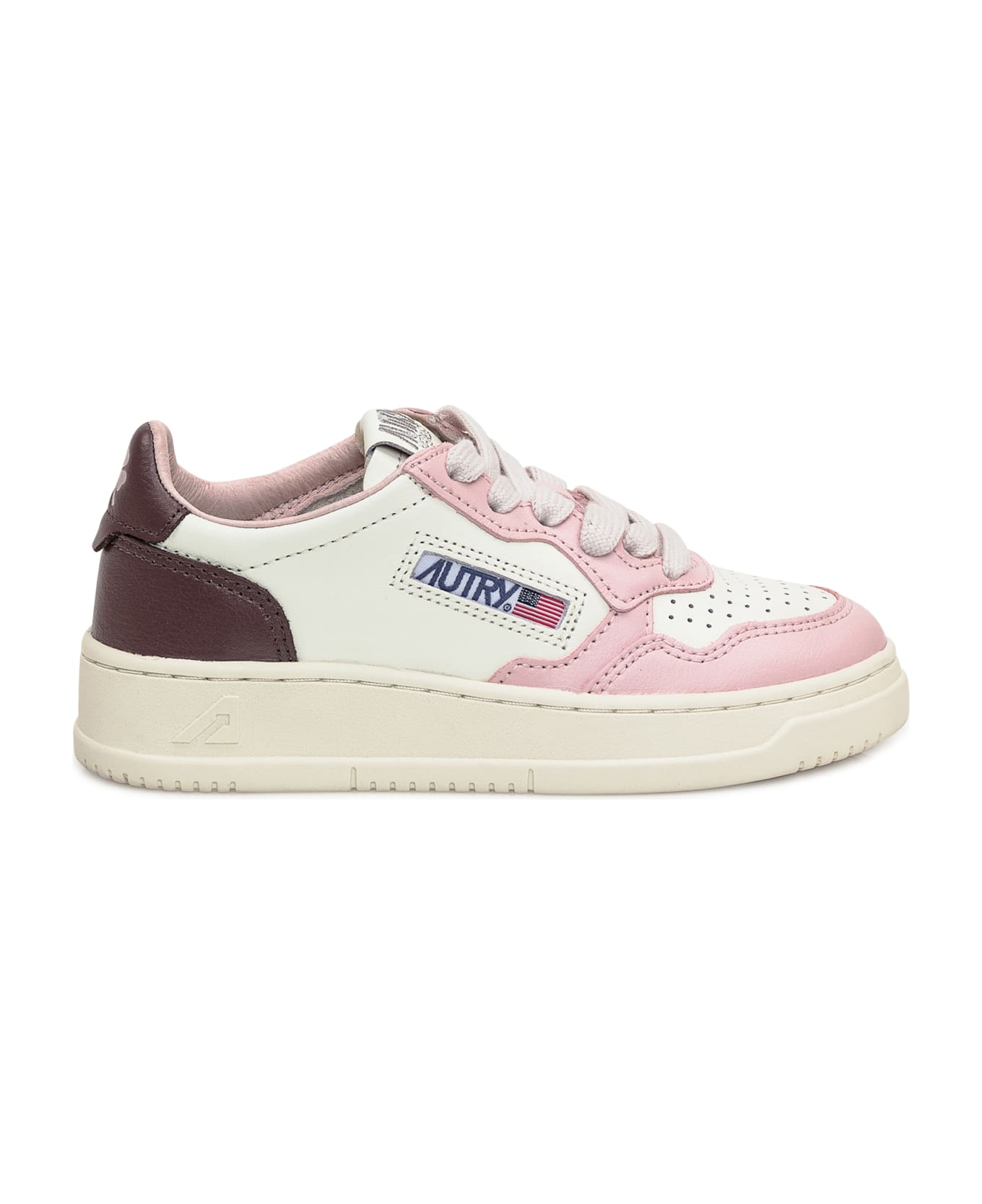 White and pink low top sneaker. Lace-up closure. Logo on tongue, heel and side.