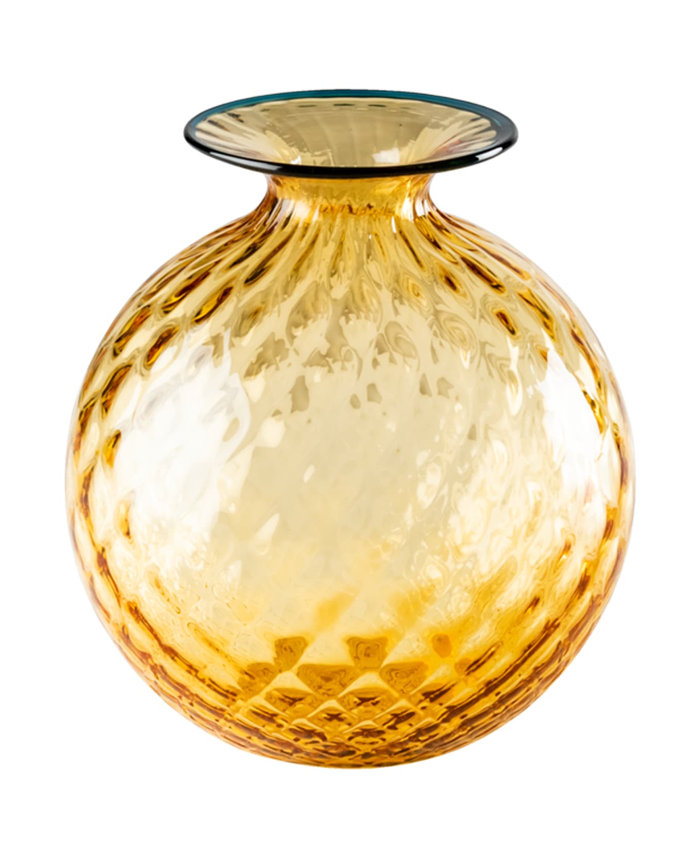 'Monofiore Balloton' glass vase. It looks soft, and yet it's glass. The optical illusion of the 1970 VENINI Monofiori is in its name: Balloton, the unique process that recreates the matelassé effect on the surface. The work is handmade, blowing in the characteristic metal mold and ended in the thin neck with a colored thread applied hot, which varies in the color.