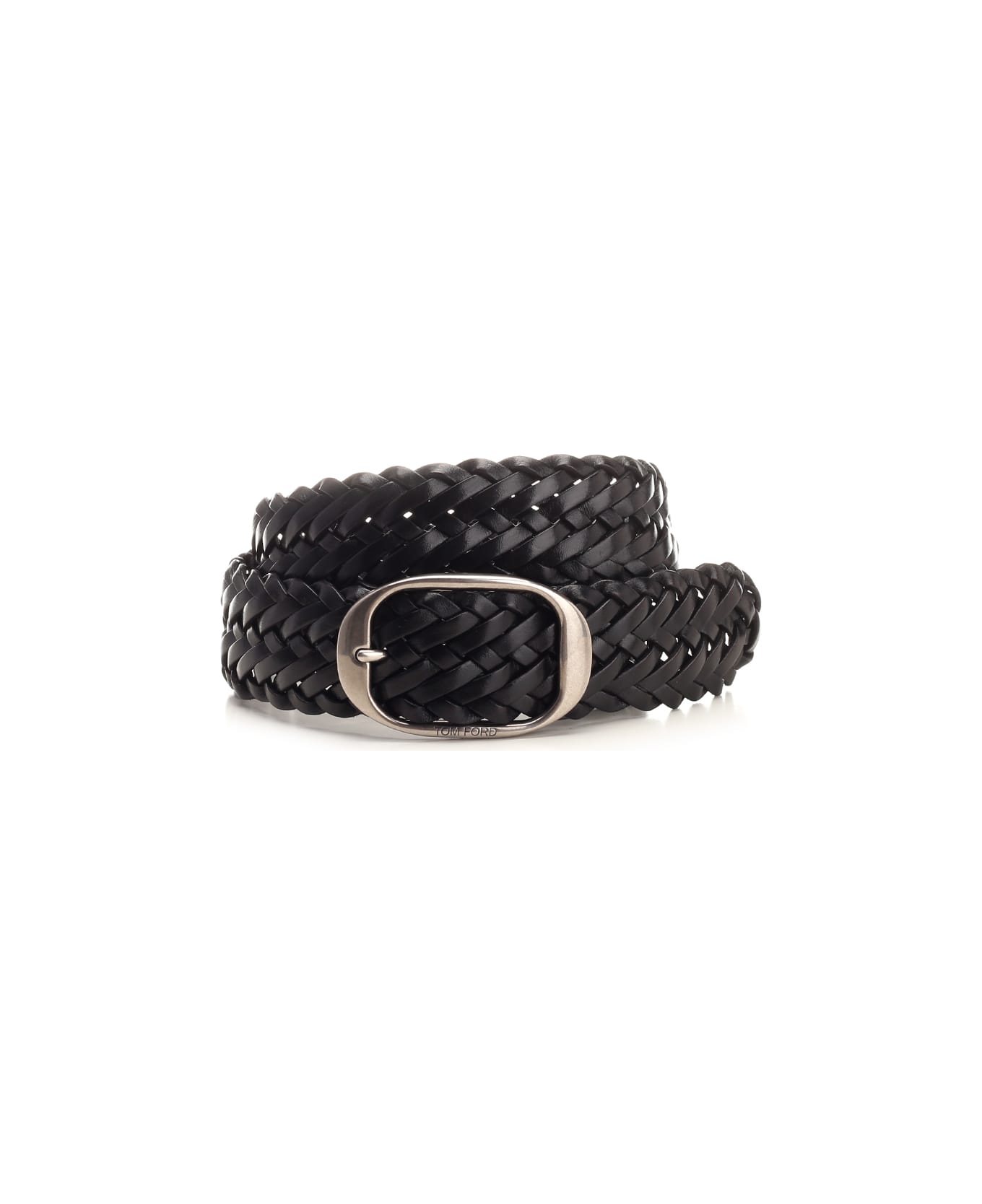Black belt from Tom Ford in woven leather, oval silver metal buckle.