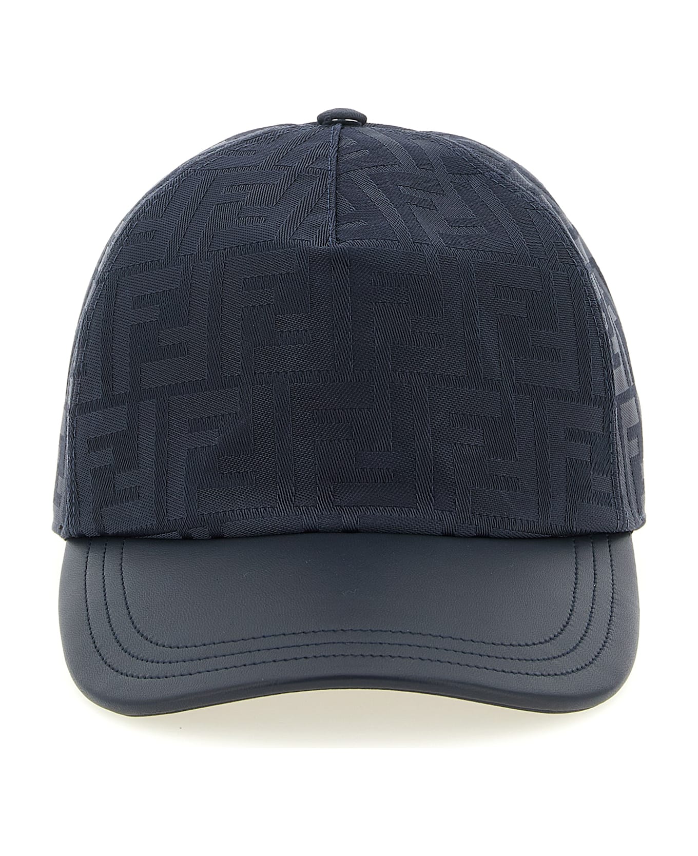FF jacquard nylon baseball cap with semi-rigid tone-on-tone leather visor, adjustable strap with rear velcro.