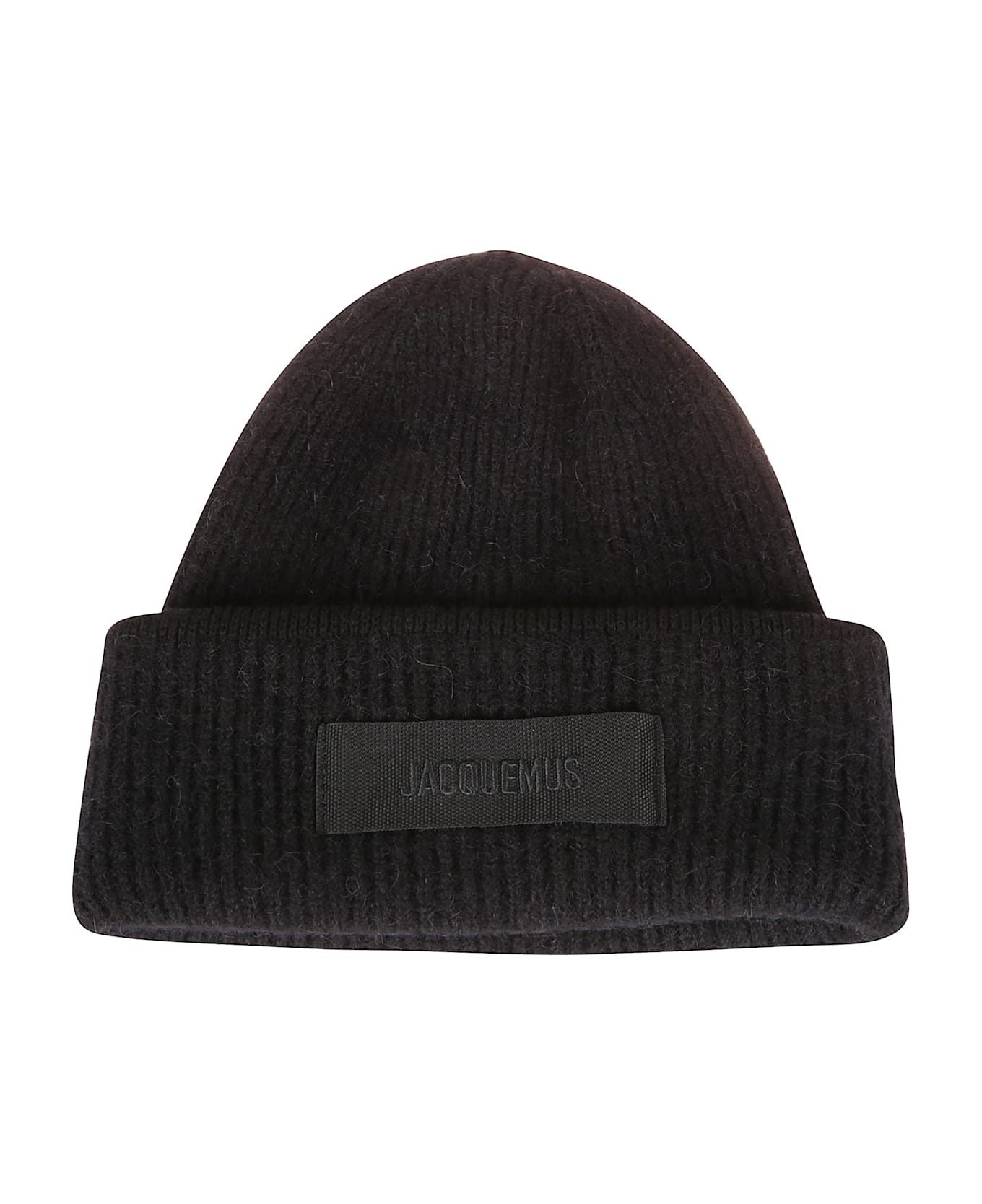 JACQUEMUS La Croisiere Gros Grain Beanie in black wool and alpaca blend, featuring an adjustable fit, ribbed knit, a tone-on-tone grosgrain logo patch embroidered on the front and a reinforced tone-on-tone edge.