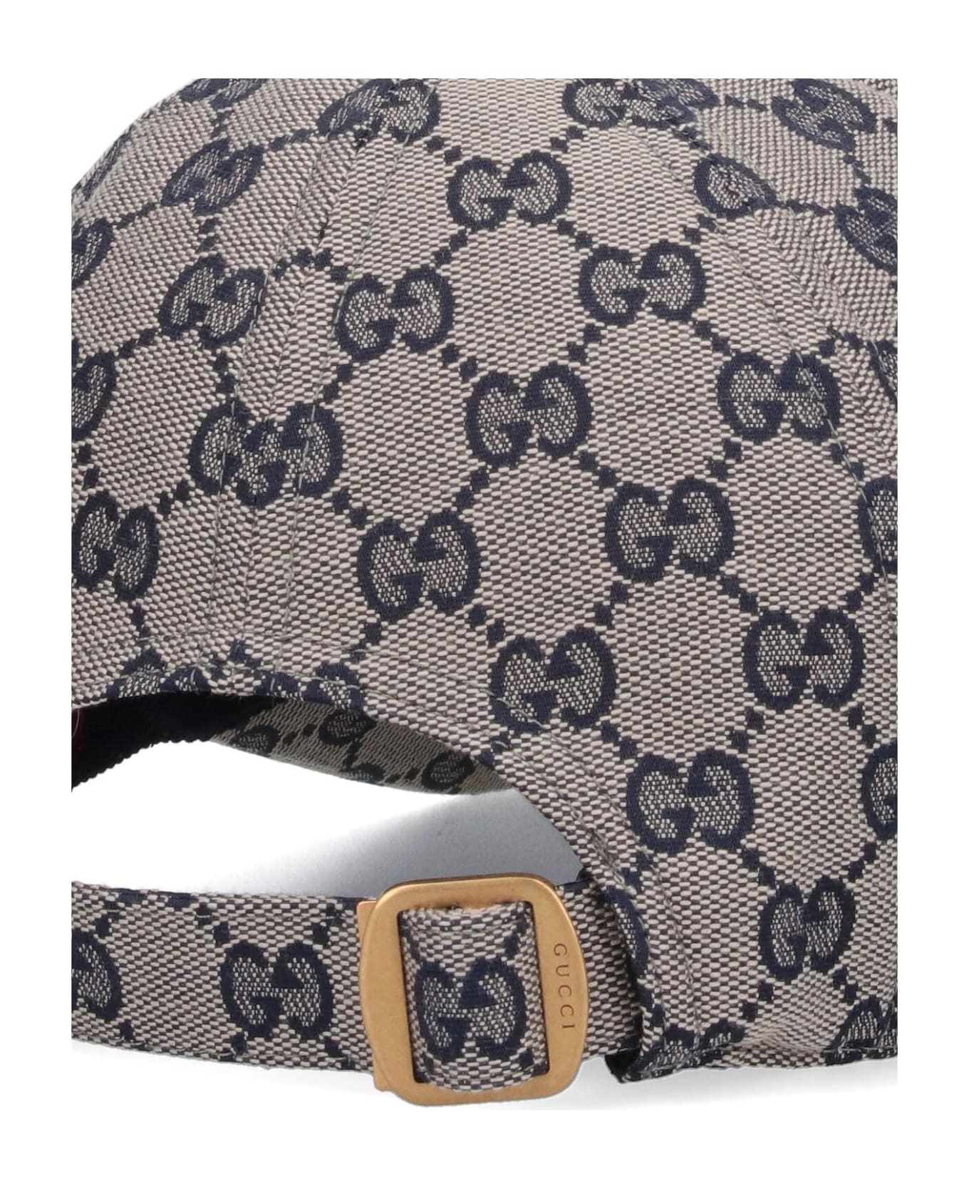 Gucci logo baseball cap in beige 'Original GG' fabric with blue details, curved visor, blue and red Web ribbon detail, adjustable back strap, gold metal buckle detail.