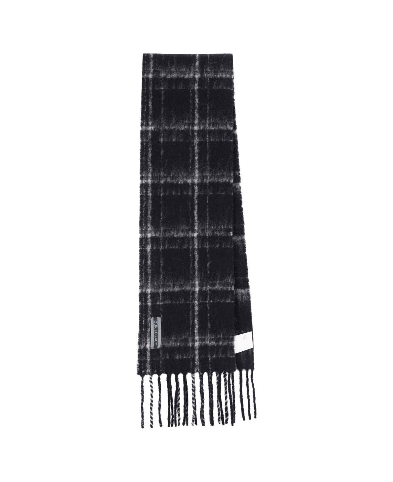 Our Legacy Estate check scarf in black alpaca and wool blend with check intarsia, gray details, front logo label, fringed hem.