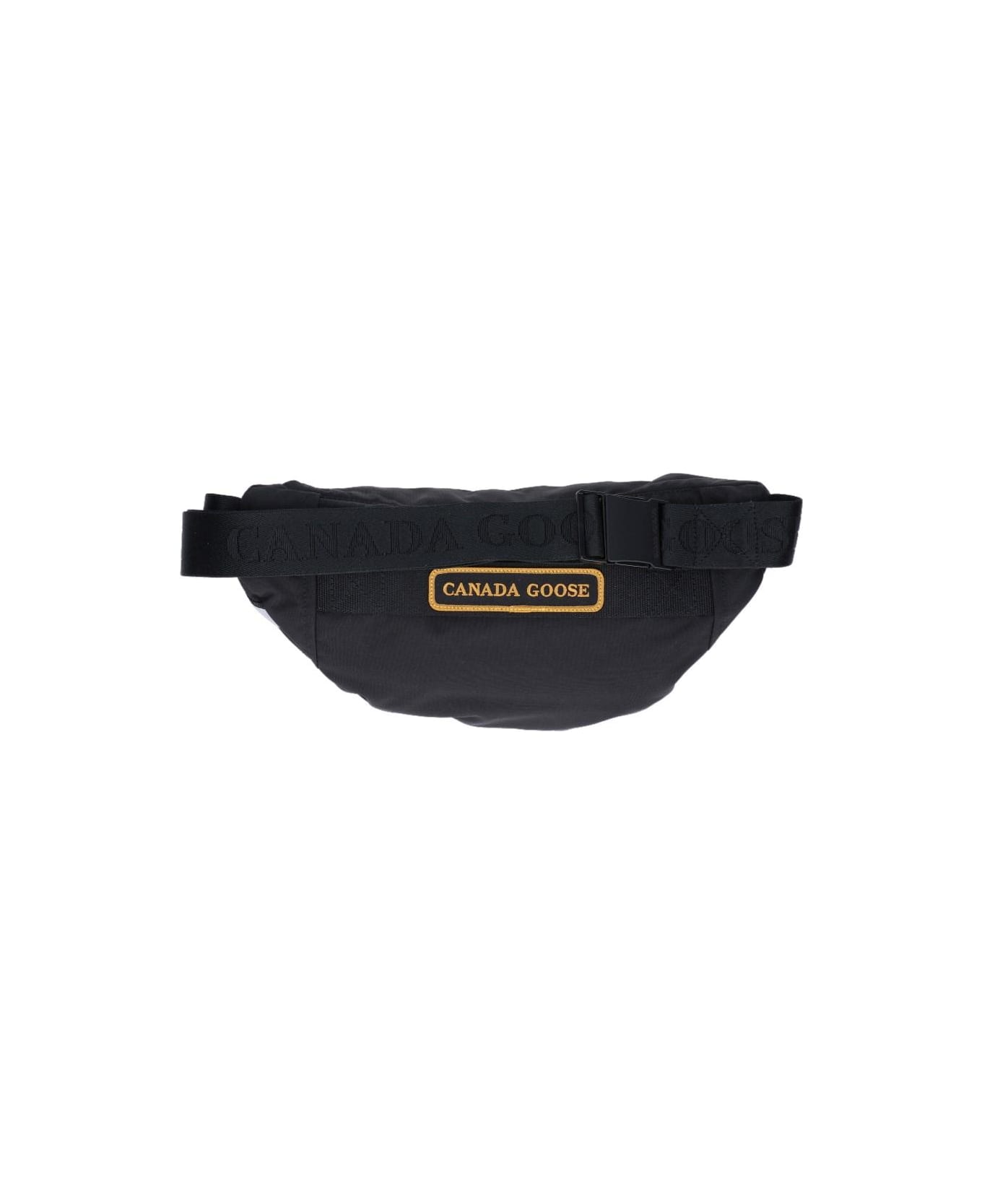 Canada Goose 'Arctic' waist bag in black fabric with top zip closure, adjustable belt at the back, multicolor logo patch on the front, flap pocket on the front, orange logo embroidery on the back, main inner compartment.