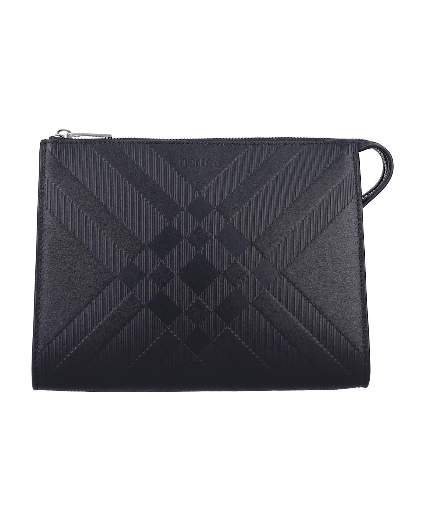 Embossed Check Leather Pouch By Burberry London. Featuring: Top Zip Fastening Embossed Check Pattern Internal Flat Pocket And Two Card Slots Height: 18 Cm Width: 23 Cm Depth: 8 Cm