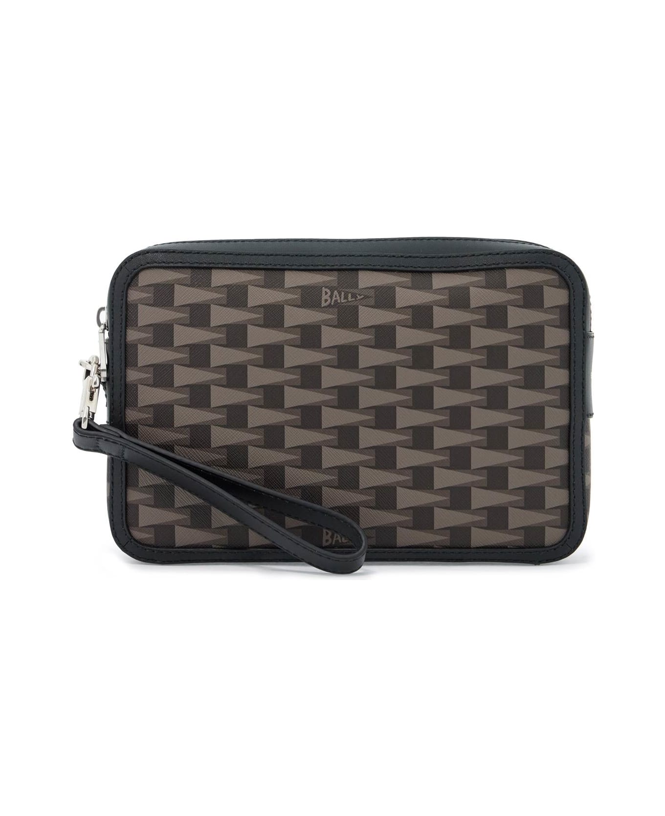 The Bally Pouch is made of coated canvas with an iconic all-over Pennant print and smooth leather finishes. It features a top zip closure, a grosgrain interior with one open pocket and one zip pocket, and a removable leather wrist handle. The metallic accessories have a palladium finish.
