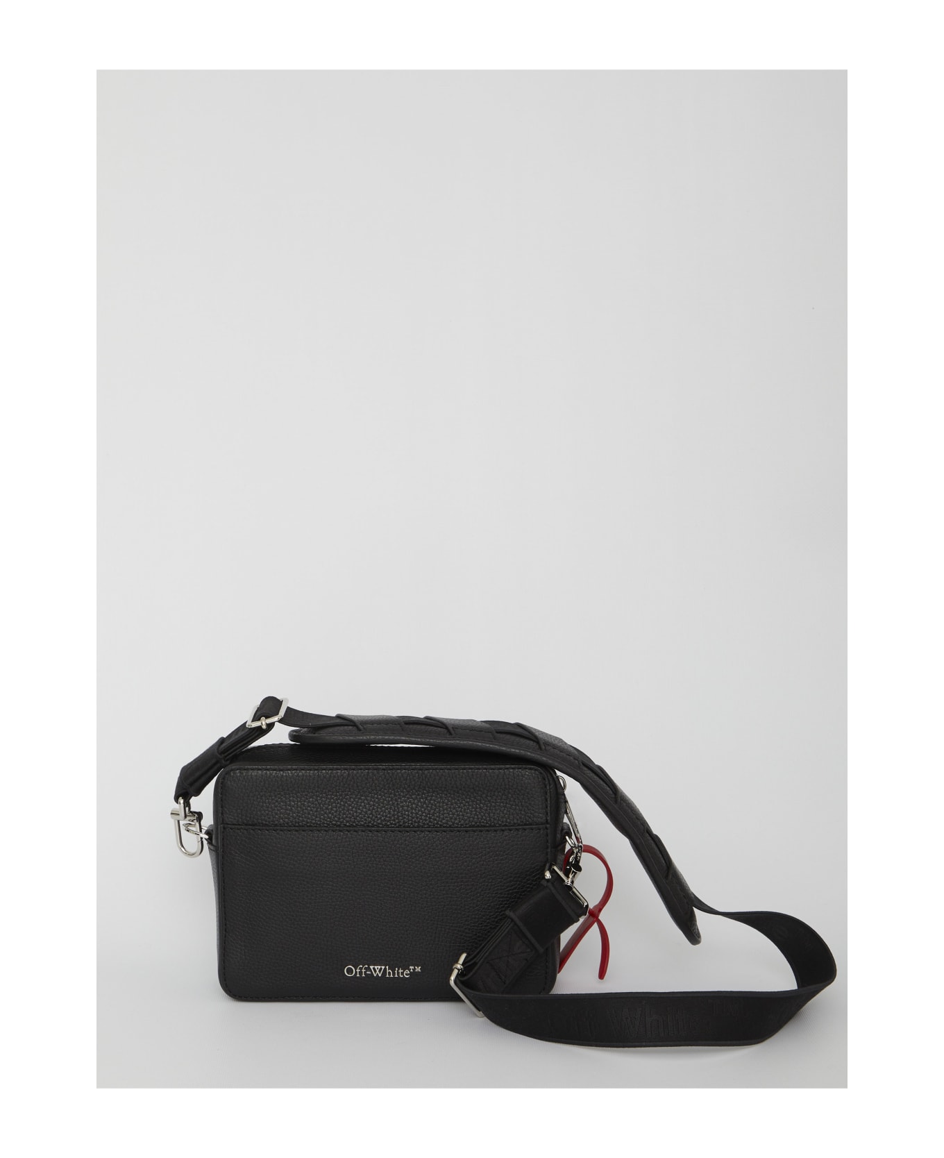 Binder crossbody bag in black grained leather with embossed diagonal-stripe details at the back. It features adjustable and detachable shoulder strap, zip closure, one main interior compartment, one interior card slot and one exterior flat pocket at front. Embossed metal Off-White logo on the front. Detachable red tag.