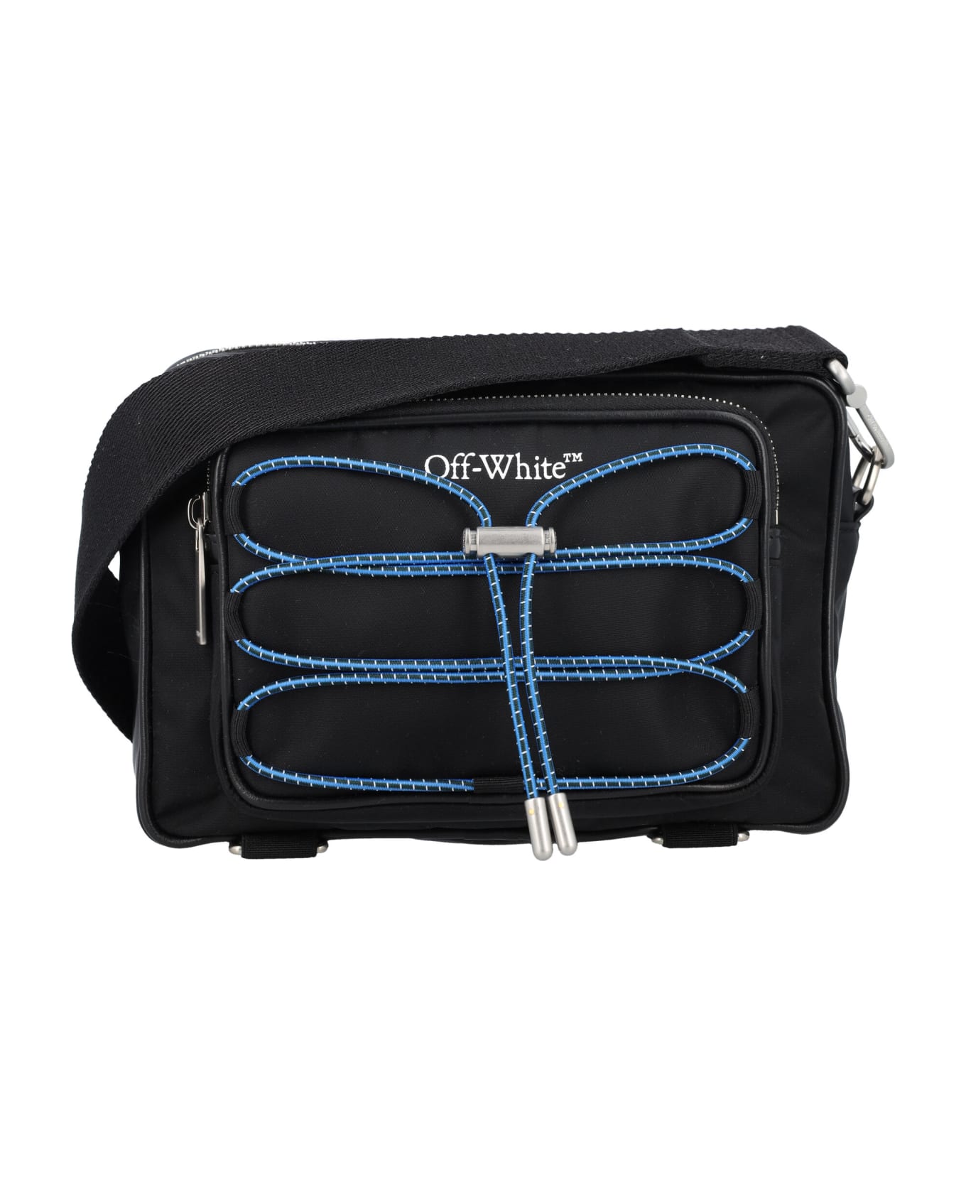 Courrier Camera Shoulder Bag By Off-white. Featuring: Black Camera Bag Top Zip White Off-white Logo On The Flat Pocket At Front Blue Laces On The Zipped Front Pocket Main Compartment With Inner Card Slot Zip Up Pockets Details Back Magnetic Flat Pocket Black Shoulder Strap Height: 15cm Width: 22,5cm Depth: 6,5cm