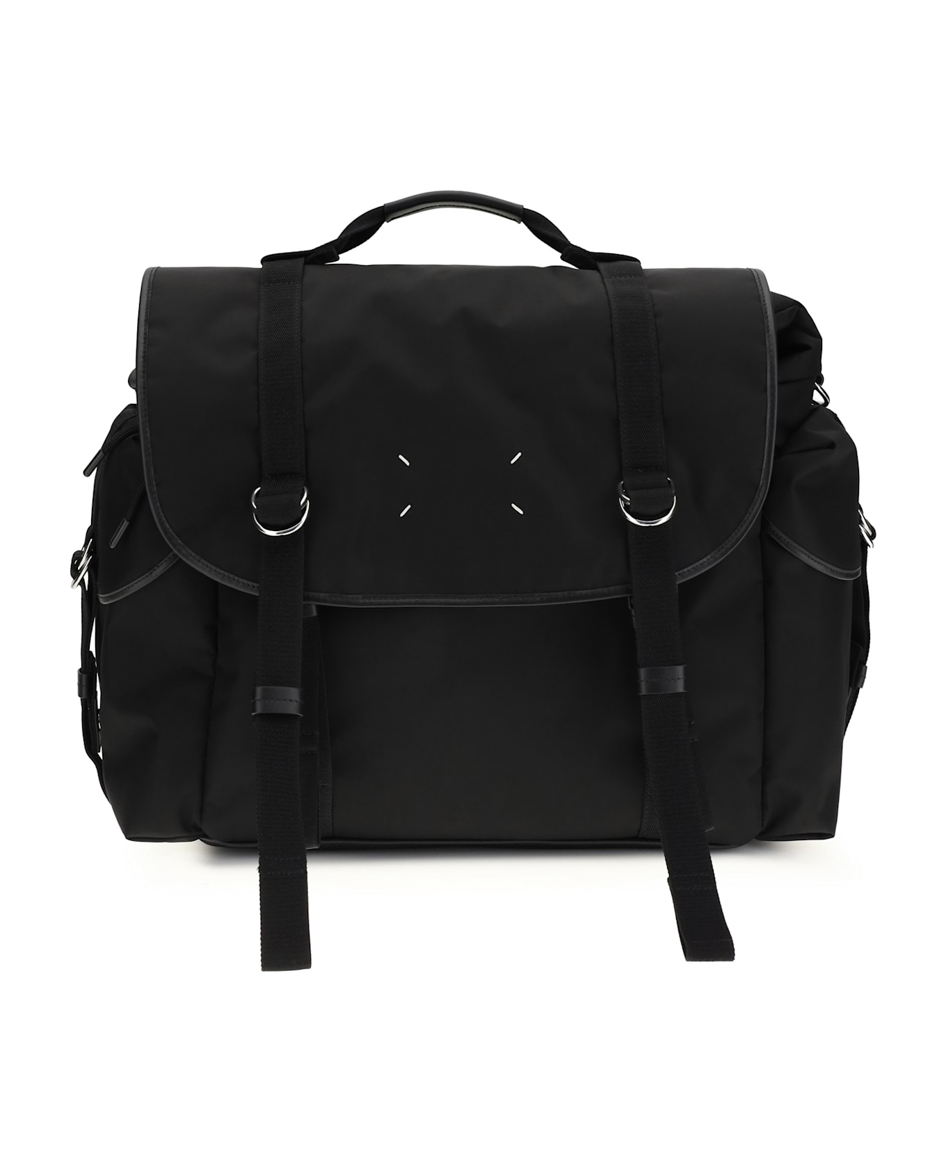 The high tech messenger bag by margiela is a functional accessory with an urban, contemporary design. made from durable nylon, it features a flap closure and straps with metal buckles that define its technical style. equipped with an adjustable shoulder strap and top handle, it offers maximum versatility of use. the model includes double side compartments, a zippered mesh compartment on the back, and a flat internal pocket for practical organization. iconic details, such as the logo lettering plaque on the back and the four stitches logo on the front, complete the bag with the maison's unmistakable signature.