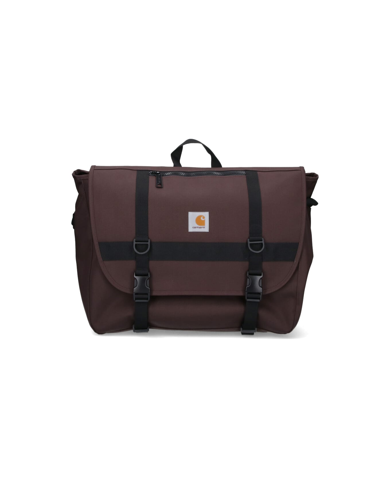 Carhartt WIP Jake Messenger shoulder bag in brown fabric with top handle, adjustable shoulder strap, front buckle closure, multicolor logo patch on the front, contrasting fabric details, front zip pocket, inner zip pocket, main inner compartment.