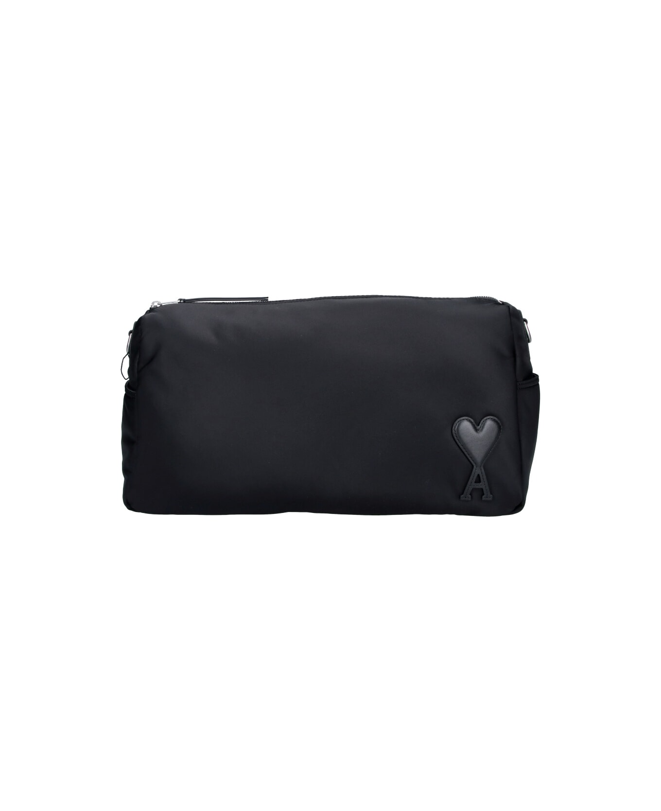 Ami 'Marcel' shoulder bag in black fabric with zip closure, adjustable and removable shoulder strap, tonal logo patch on the front, back zip pocket, inner flat pocket, main inner compartment. Composition: 100% Polyamide
