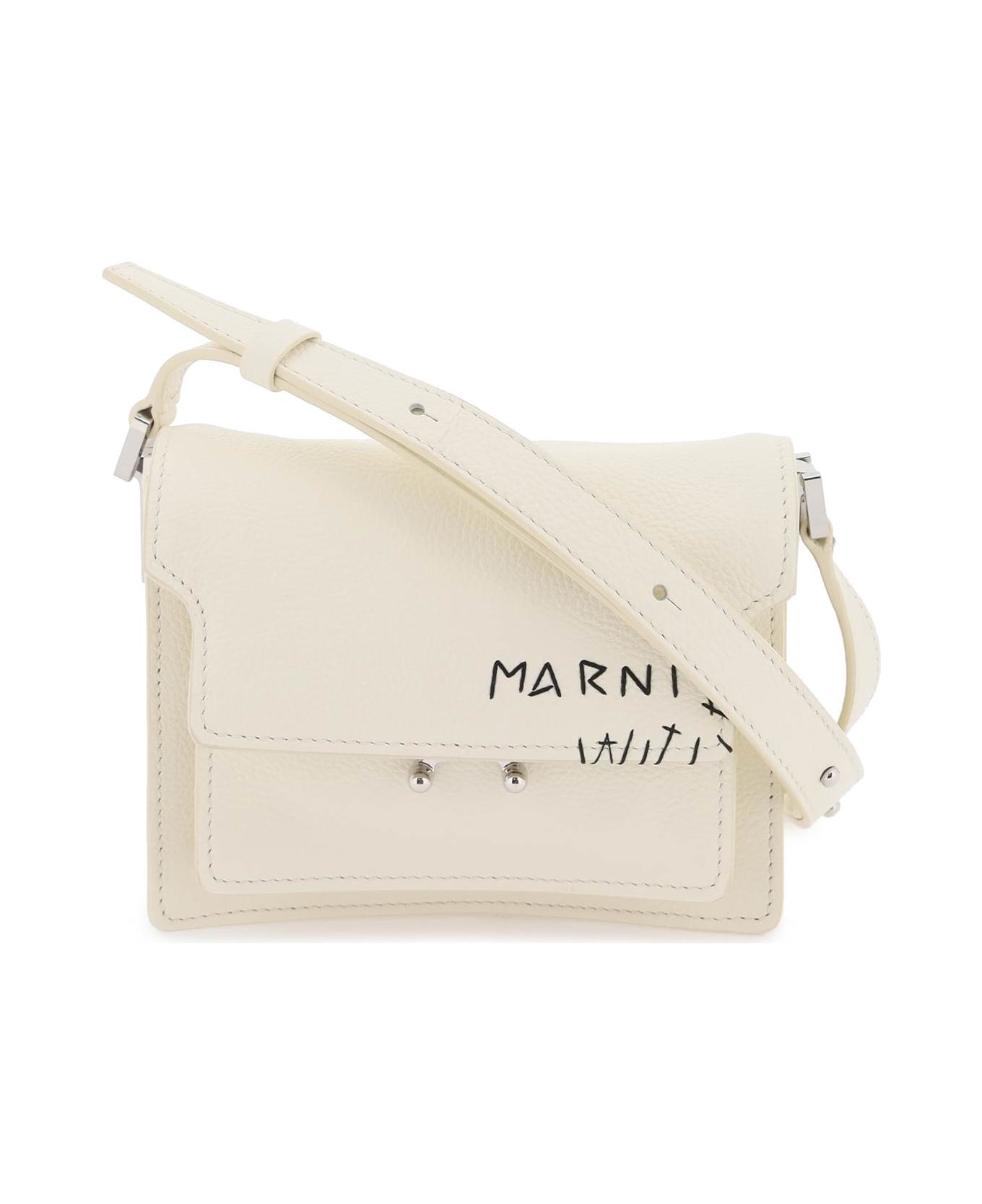 The Marni Trunk Soft mini shoulder bag is made of hammered leather with an adjustable strap and a snap closure flap. It features a back slit pocket, three compartments, one internal zip pocket, and a flat pocket with logo patch on the fabric lining. The flap is embellished with embroidered logo lettering. Metallic accessories have a silver finish. Composition: 100% calf leather