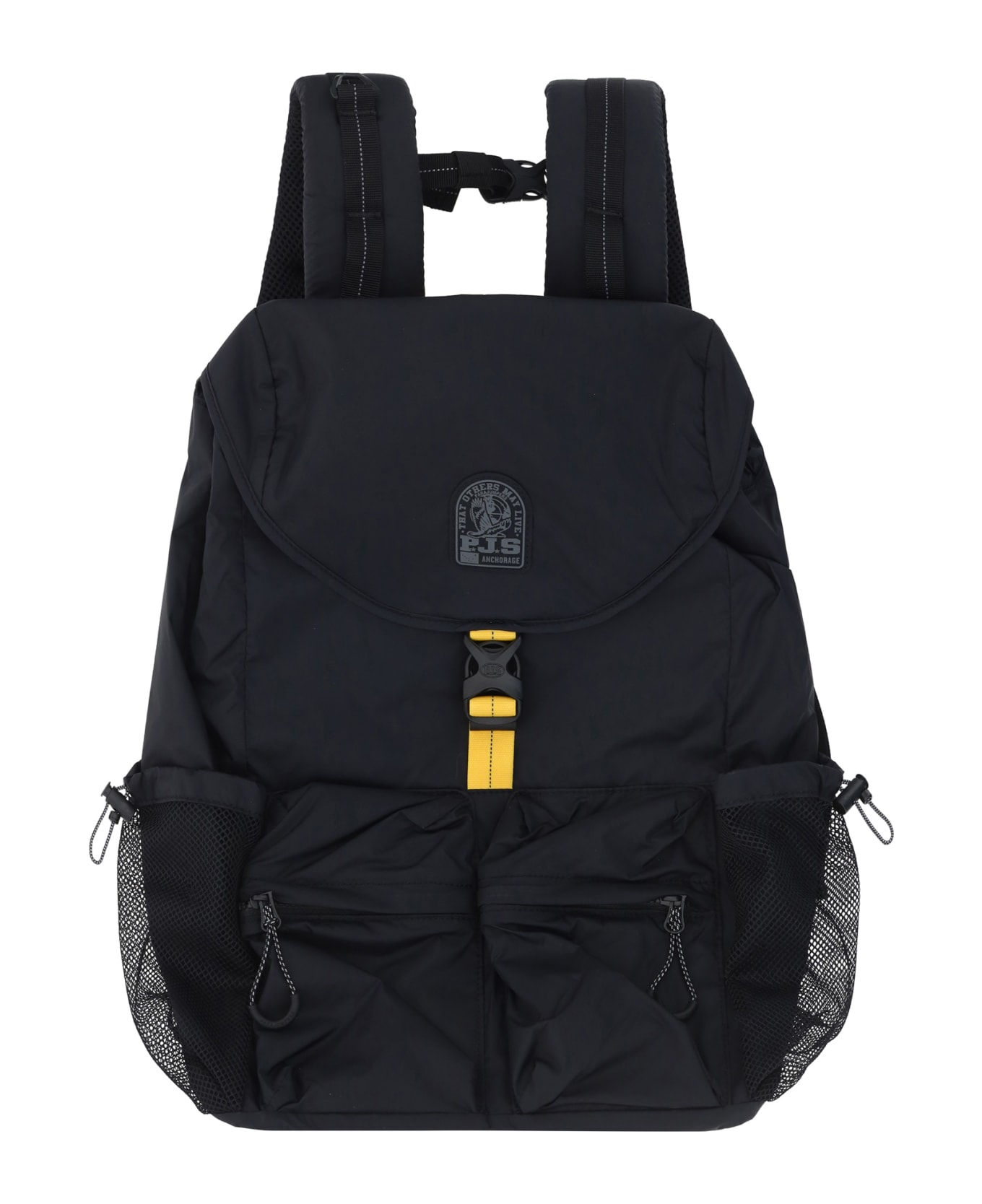 Mitchell backpack by parajumpers, padded top handle, adjustable shoulder straps, main compartment with zipper for closure, large front pocket, two adjustable safety clips on front, one welt pocket on front, iconic embossed brand logo on front, compartments and mesh pockets inside.