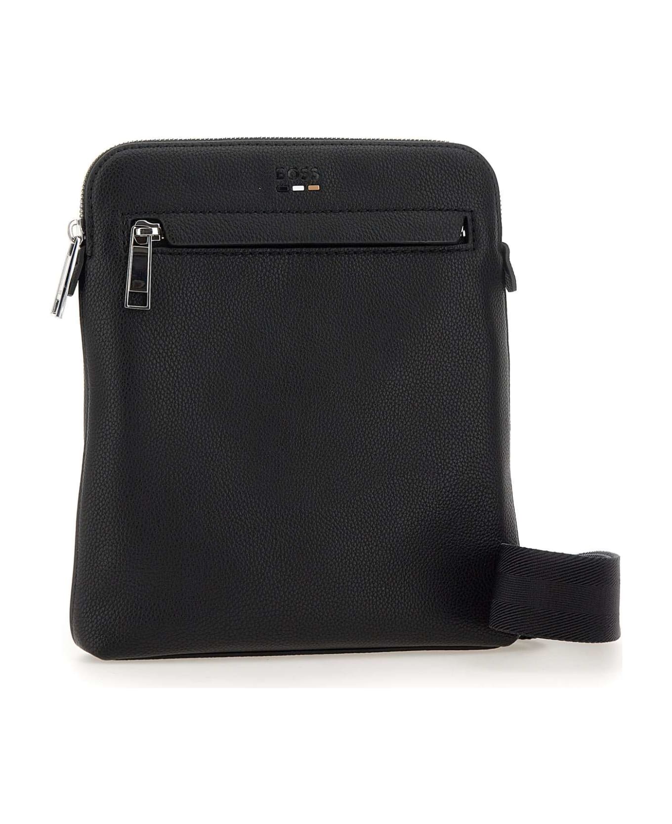 Boss 'Ray Small' men's shoulder bag made with leather-effect recycled material, front zip pocket, front logo, top zip fastening, silver hardware, adjustable shoulder strap, inside zip pocket. Dimensions: length 20cm, height 23cm.