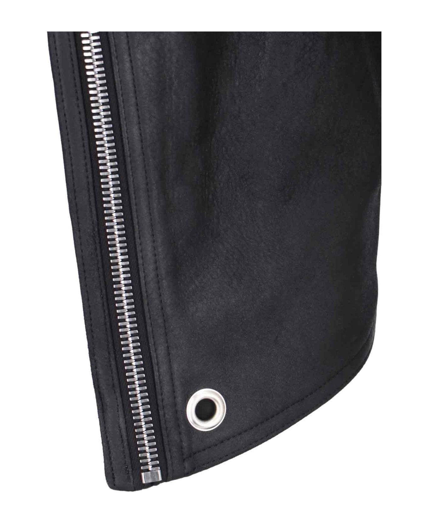 Rick Owens 'Bauhaus Harness' black leather vest with open front design, thin straps, two maxi front zip pockets, two side zip pockets, thin tone-on-tone nylon appliqué on the back, curved hem.