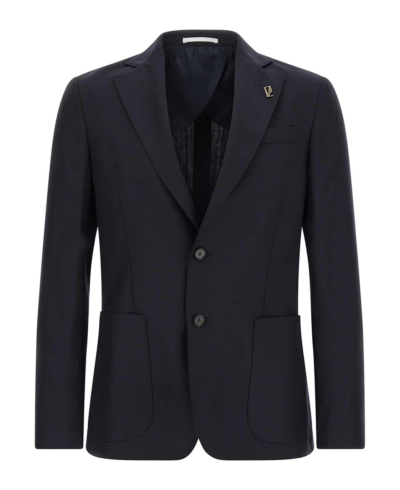 Deconstructed single-breasted Baron blazer in cool piqué wool with front button closure, mirror lapels with removable metal brooch, breast pocket, patch pockets, cupro half lining, two inner pockets, cuffs with opening buttonholes, back vents.