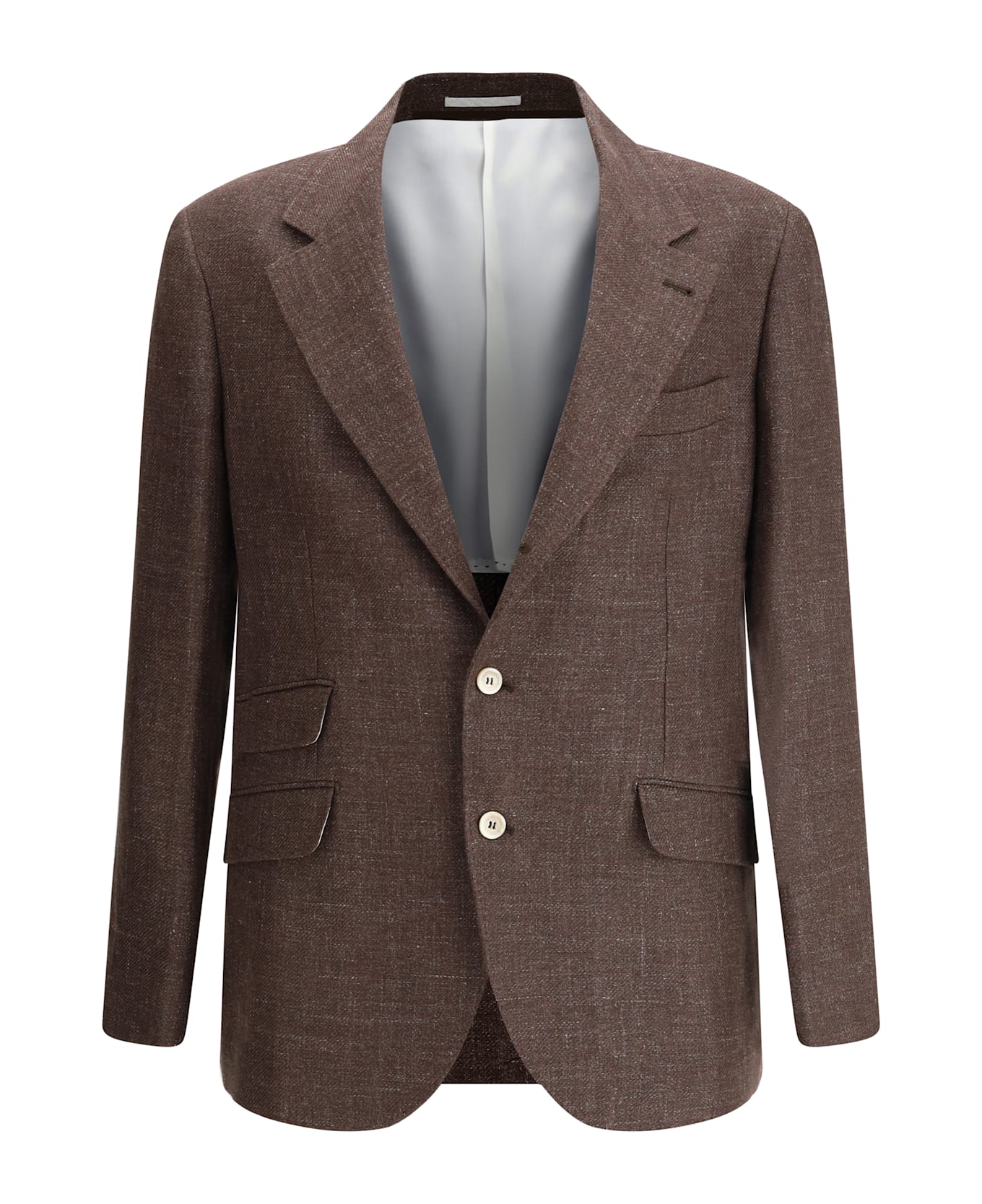 The linen blazer jacket by brunello cucinelli is an elegant and sophisticated piece, perfect for a refined yet light look. the front button fastening and the classic lapels give it a formal yet modern look. the three welt pockets with flap on the front and the welt pocket add a practical and distinctive touch, keeping the design clean and tidy. two slits on the back complete the piece, ensuring comfort and freedom of movement. the mélange pattern, with its light combination of colours, gives a nuanced and sophisticated effect, while the regular fit ensures a comfortable and versatile fit, perfect for different occasions.