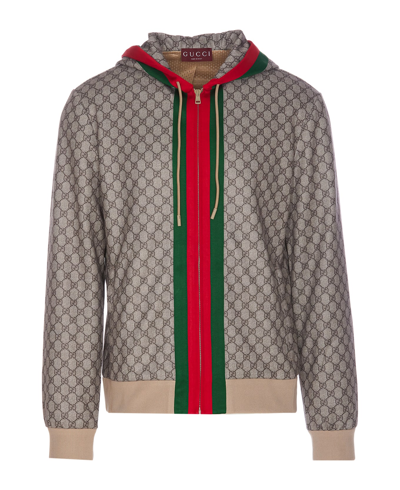Gucci beige jacket with zip closure, all over GG logo, hood detail with coulisse, long sleeves, lateral zip pockets, Composition: 55% Polyester, 45% Cotton