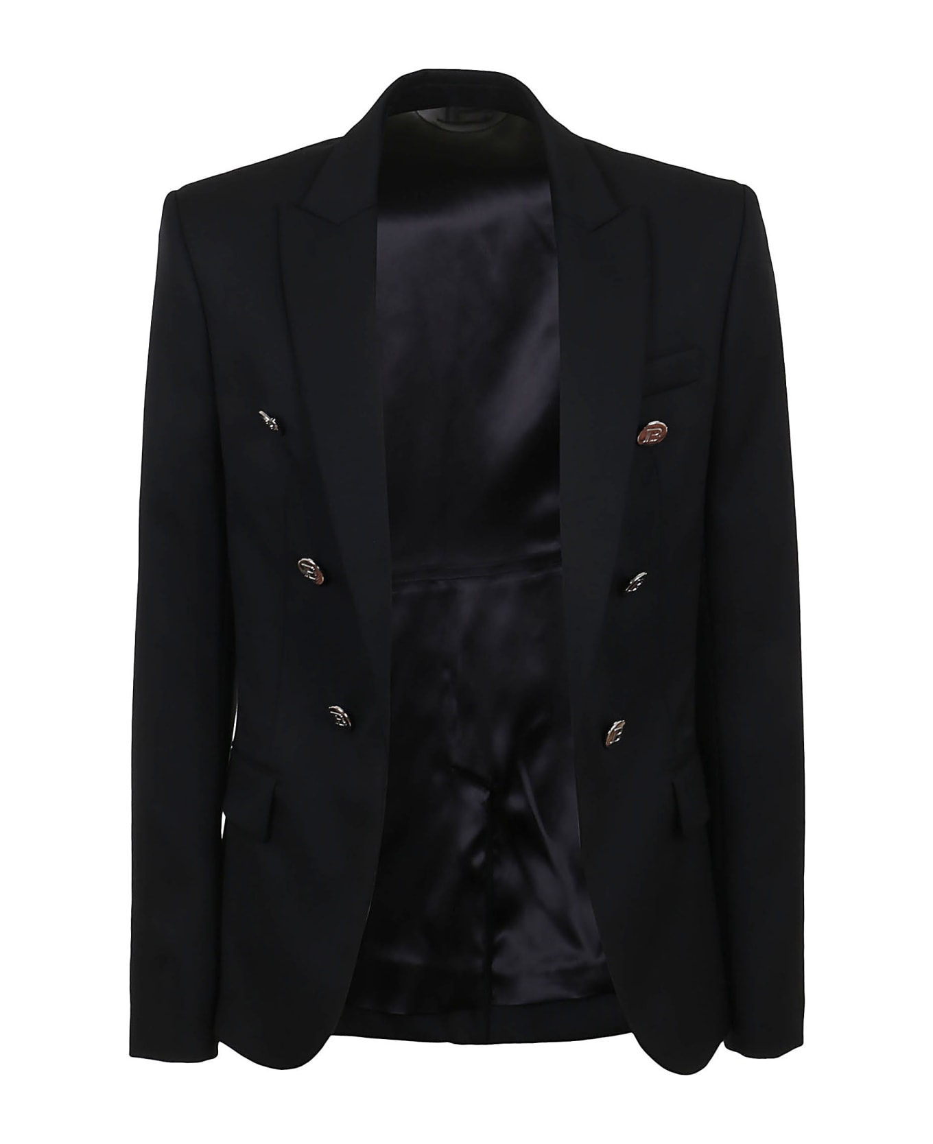 Wool blazer BY BALMAIN. Double-breasted closure; two front pockets with flap and one welt pocket on the chest. Body-hugging fit design. Silver embossed button detail, also present on the cuffs.