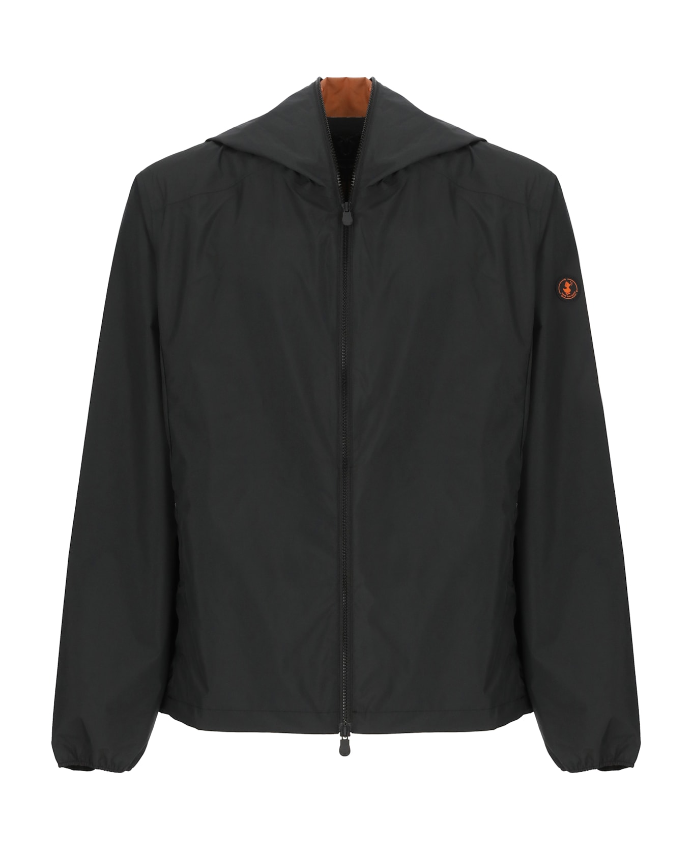 - Black Save The Duck tech fabric waterproof jacket for man - Hood - Long sleeves - Rubber logoed patch at left sleeve - Two front zip fastening - Front zip fastening