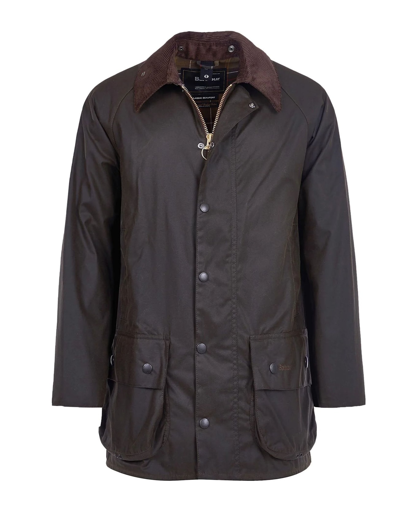 Classic Beaufort® Waxed Jacket, hunter green, Mediumweight Barbour Sylkoil, Pure cotton Barbour Tartan lining, Corduroy collar, Two way zip, Two large bellow pockets, Two handwarmer pockets, Full width, lined, rear game pocket with side zips, Velcro faste