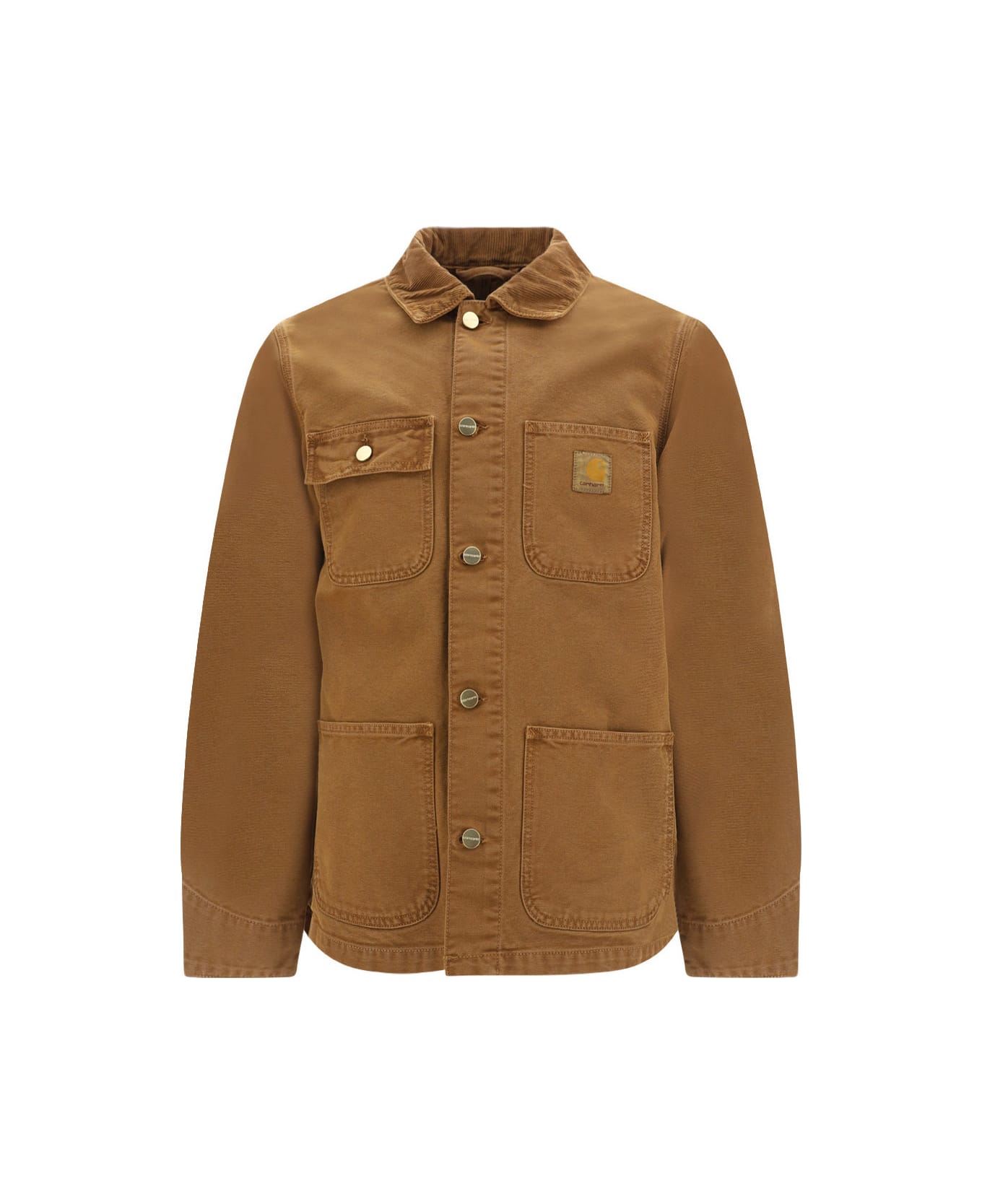 Cotton michigan jacket by carhartt, classic ribbed collar, embossed button front closure, four large patch pockets on the front, contrasting embroidered brand logo patch on the front, adjustable button cuffs, regular fit.