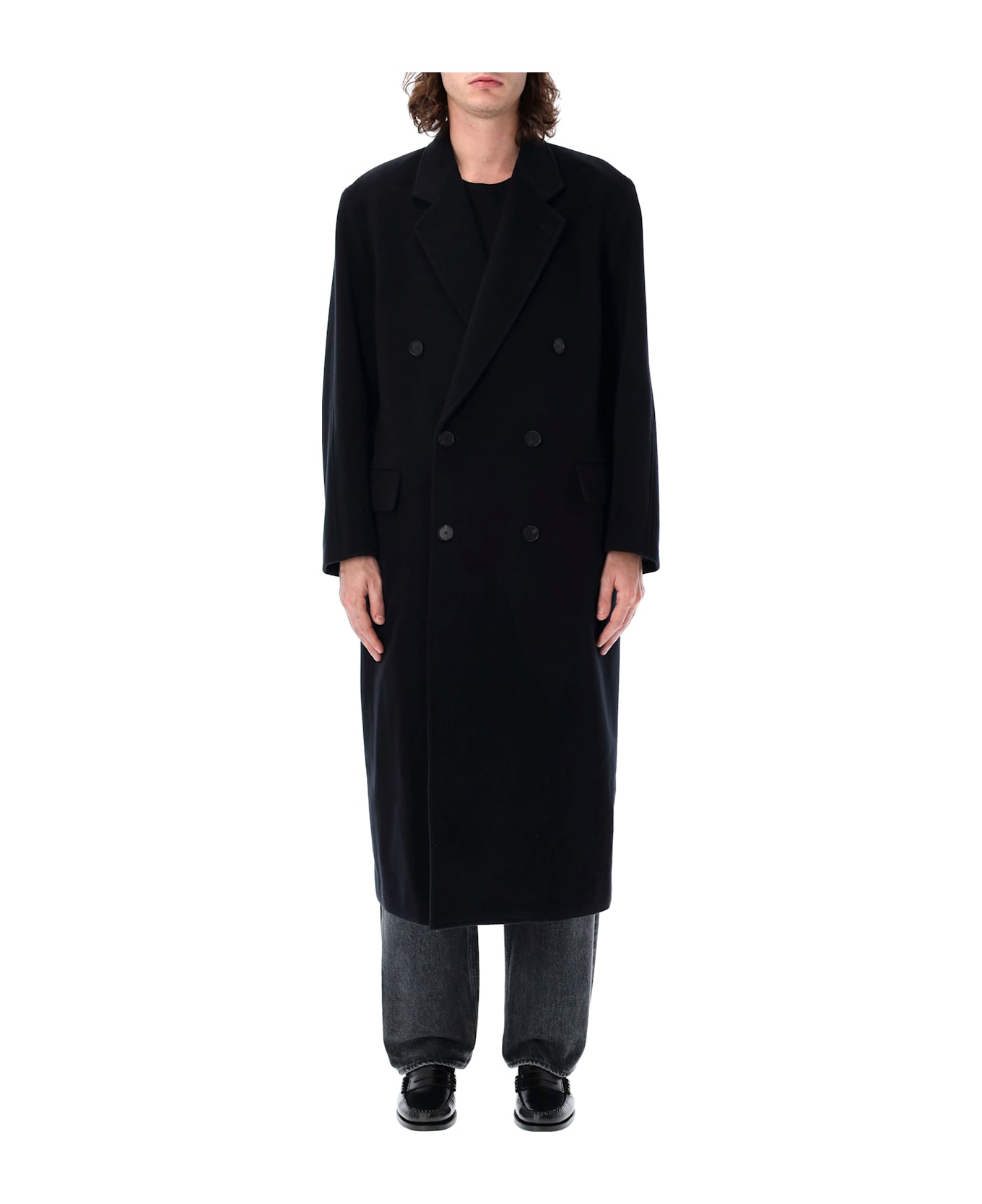 Super Fine Wool Mosser Chesterfield Coat By Auralee. Featuring: Notch Lapel Double Breasted Buttons Fastening Side Pockets Full Lining Single Vent Around Ankle Length Oversized Fit Model Is 1,90 M And Wears Size 4