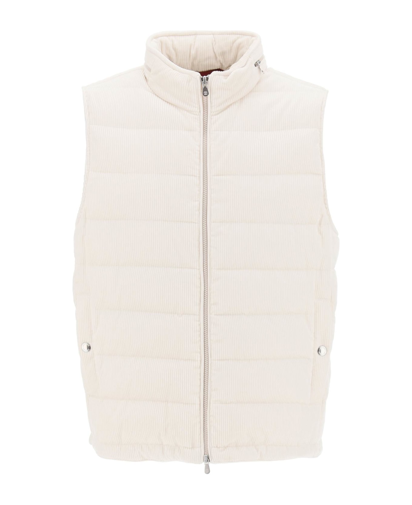 Brunello Cucinelli puffer vest crafted in Sea Island pure cotton corduroy. Quilted design padded in goose down featuring stand collar with packable hood, front two-way zipper fastening, side pockets with press-studs and adjustable hem with drawstring. Lined interior in nylon with two pockets and a pen holder. Regular fit. The model is 187 cm tall and wears size L. Garment foldable in its supplied box.