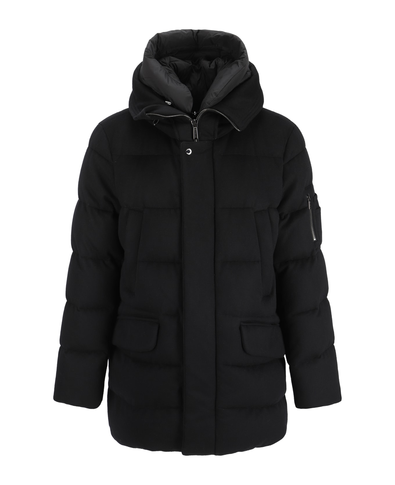 Davide-lsl parka jacket by moorer, double layer front closure: inner part with closure by two-way zipper and removable zipper on front, outer part with flap and snap buttons for closure. high collar design with drawstring adjustable hood, two front welt pockets, two slit pockets with flap on front, zippered patch pocket on left sleeve, all-over quilted and padded design, monochrome pattern, regular fit.