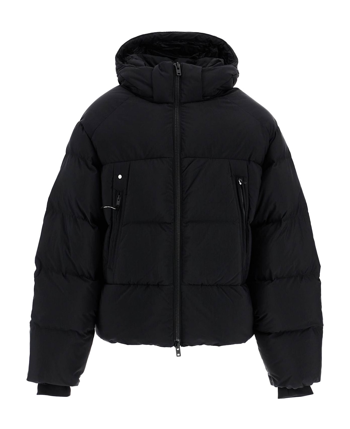 The Y-3 quilted jacket is made of recycled Pertex Quantum nylon and filled with feather padding. It has a relaxed fit with a high collar and detachable hood, complete with zippered side pockets, elasticized cuffs, adjustable hem, and two internal pockets. The model is 182 cm tall and wears size M.