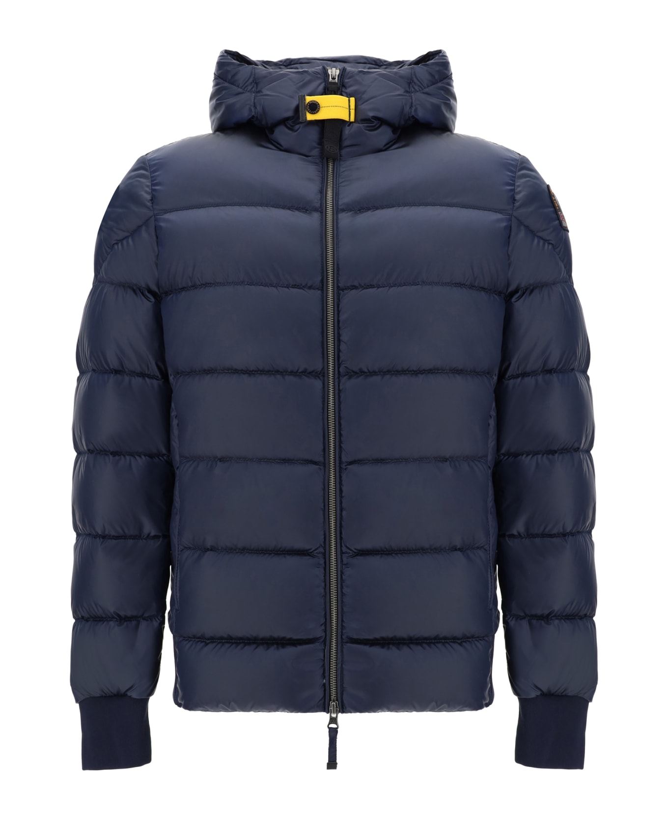 Pharrell down jacket by parajumpers, hooded design, front zipper closure, iconic contrasting strap on front neckline, padded and quilted design, two side slit pockets with zipper, elastic ribbed cuffs, slim fit.