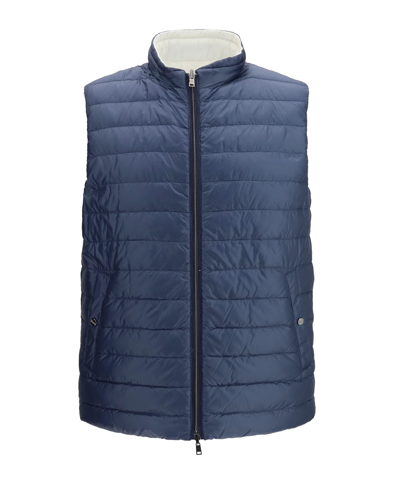 The reversible gilet by herno delivers sophisticated functionality through a clean and versatile design. the front closure with coloured zip adds a dynamic accent, while welt pockets finished with a single button preserve a streamlined and balanced look. designed to adapt to multiple styling options, the piece reflects herno s technical elegance and meticulous craftsmanship.