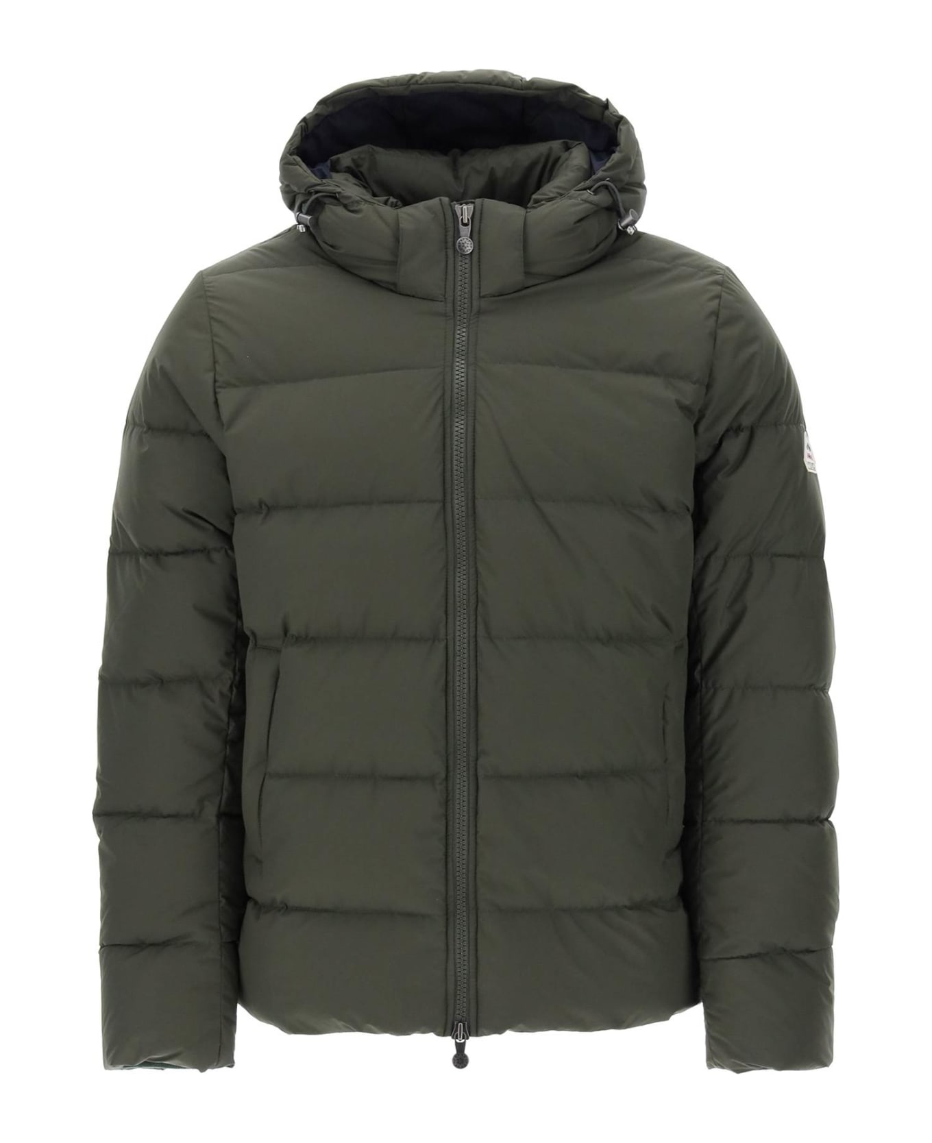 Pyrenex short quilted down jacket in waterproof matte mini ripstop with duck down and feather padding. It features removable hood with elastic drawstring and metal stopper, two-way zip closure, zip pockets, ribbed knit inner cuffs, drawstring hem. Logo patch on the left sleeve. The model is 183 cm tall and wears a size L.