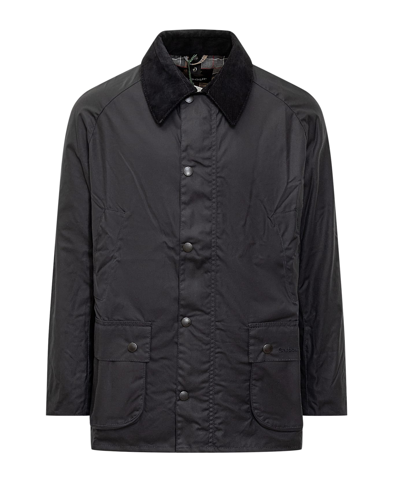 Blue jacket with waxed cotton cover. Classic collar. Chest pockets. Pockets with flap and buttons. Embroidered logo on the front. Closure with zip and buttons.