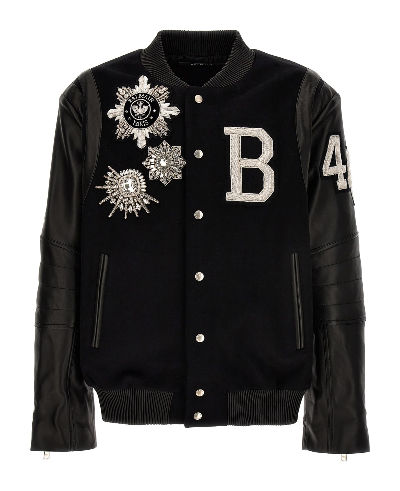 'Baseball' leather bomber jacket with snap button closure, embellished with jewelry applications and beaded embroidery.