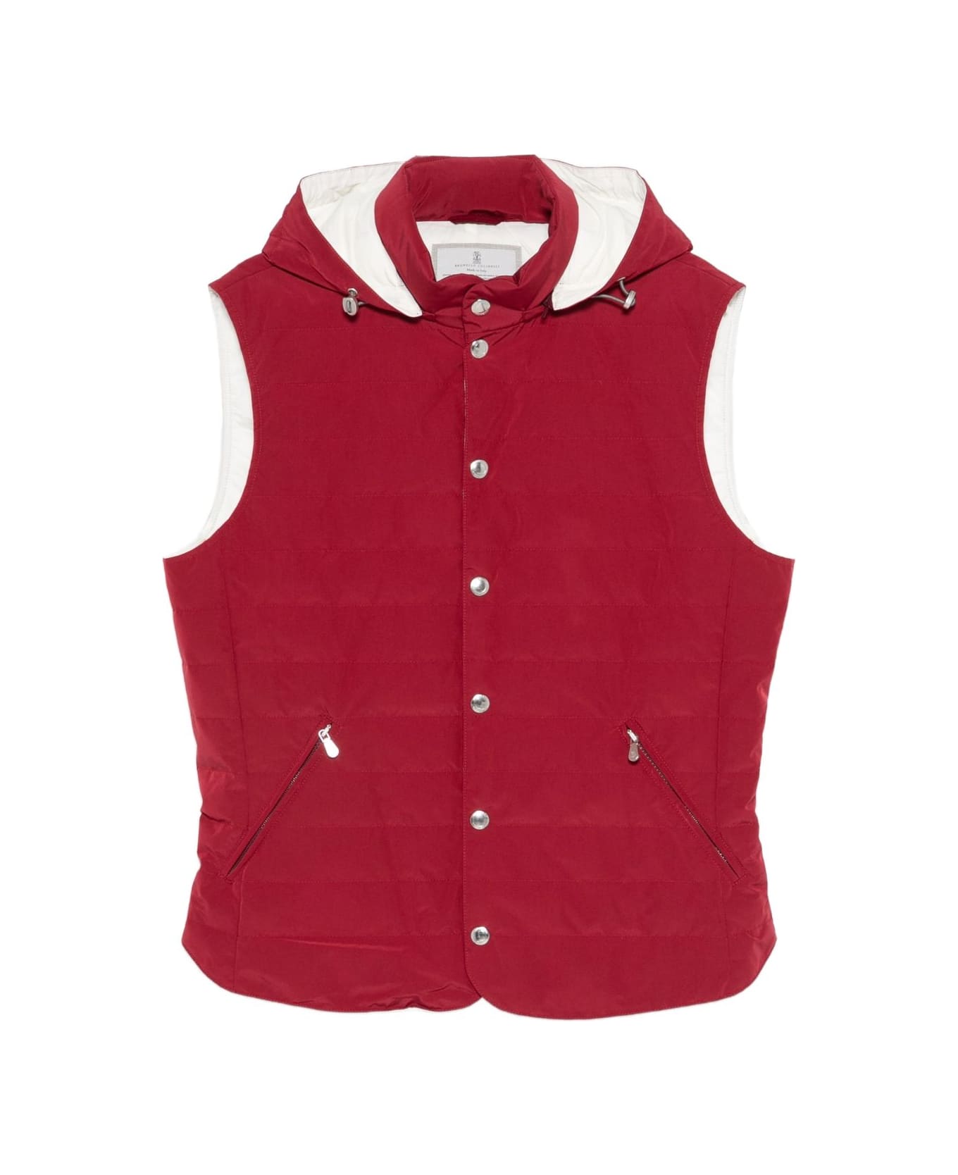 red quilted front zip fastening metal button fastening hooded zip pockets