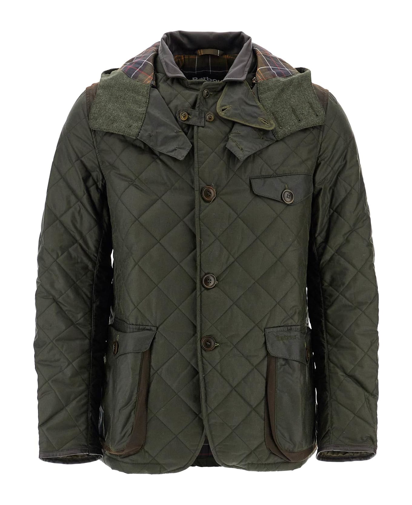 Inspired by the Commander jacket, this quilted waxed cotton Driving jacket from the Barbour x TO KI TO collection stands out for its multifunctionality and versatility. The design features a removable hood and a stand collar that can be turned into a lapel for a more tailored look. It also has numerous pockets on the front and back, a throat strap, contrast waxed cotton inserts on the elbows, front pockets, and shoulders. Leather details, tartan lining, and two interior