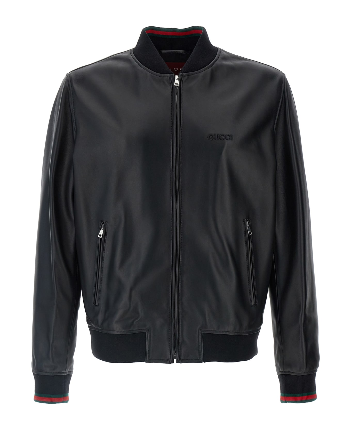 Leather bomber jacket with front embroidered logo, zip closure, pockets, long sleeves with knitted cuffs.