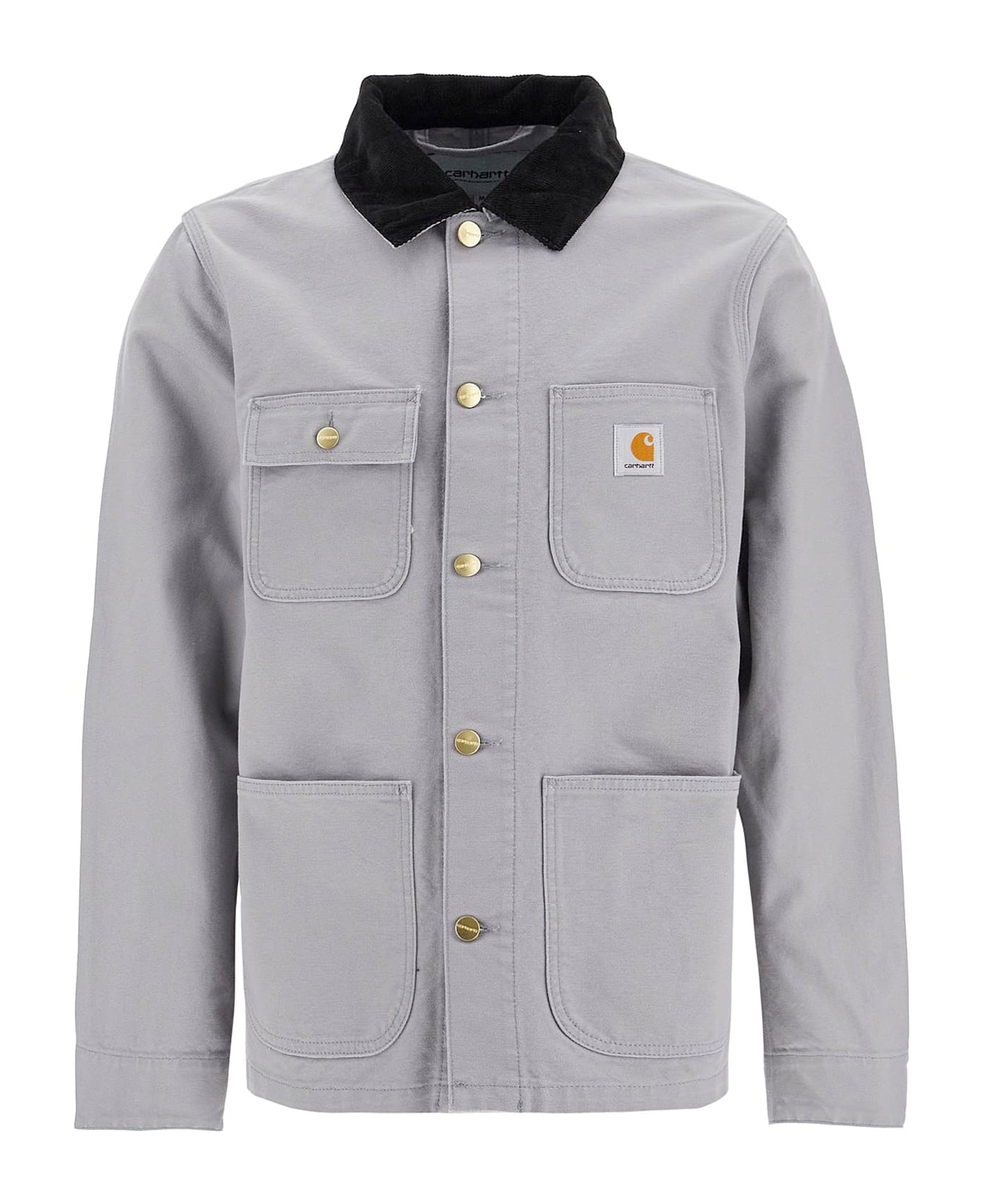 Carhartt WIP button-up jacket made from organic cotton Dearborn canvas with a contrast corduroy collar. Detailed with branded buttons and reinforced stitching throughout, it features a straight cut with four patch pockets, adjustable cuffs, and the signature square logo label at the chest. Unlined. The model is 182 cm tall and wears a size M. Composition: 100% CO (org)