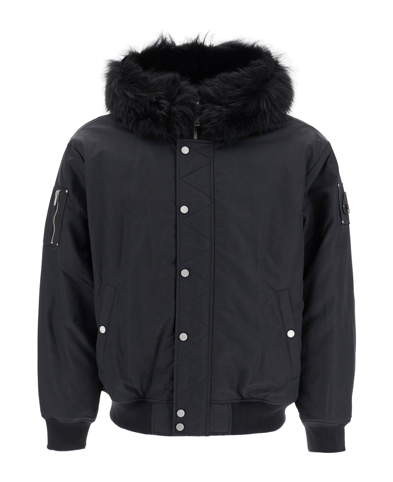 The Denali Bomber by Moose Knuckles is made of water-resistant satin nylon with recycled polyester padding and quilted lining. It features a shearling hood, two-way zip and snap button closure, side pockets with snap closures, a small pocket on the right sleeve, and ribbed cuffs and hem. The design is completed with a metal logo on the left sleeve and an engraved D-ring on the back yoke. Double inner pocket. The model is 187 cm tall and wears size L