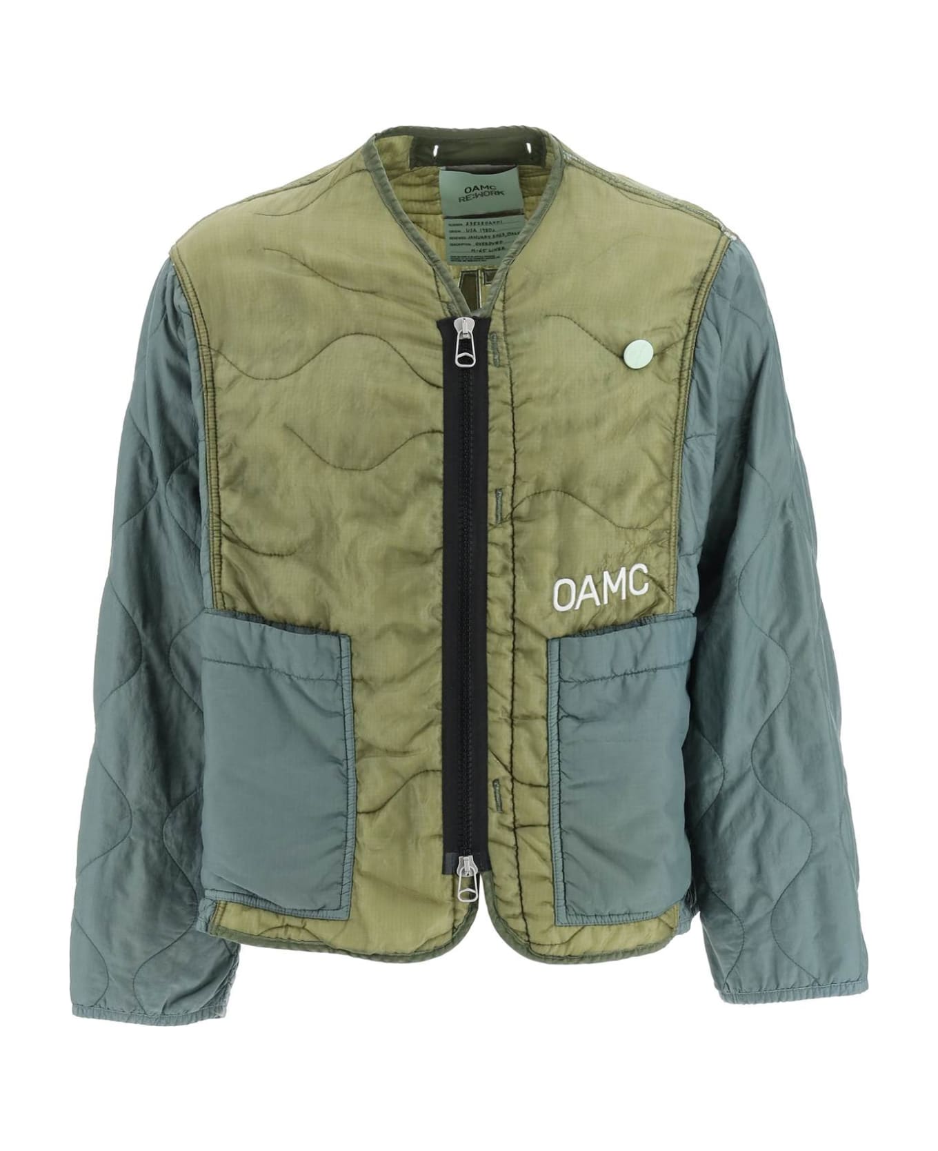OAMC short liner jacket crafted in nylon ripstop, graphic quilted and characterized by color-block and lived-in effect, being a reworked vintage garment. It features V-neckline, two-way zipper closure, patch front pockets. FInished with alluminium pin applied at front, "Peacemaker" lettering patch at back, cut-out details under the sleeves. Boxy fit. The model is 187 cm tall and wears a size L.