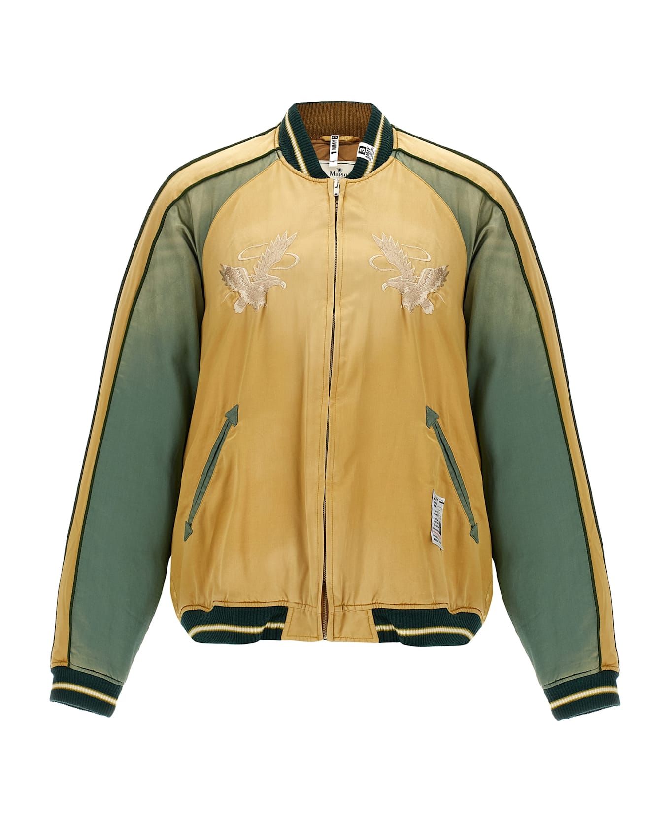 'Souvenir' bomber jacket in cotton and rayon blend used effect with contrasting ribbed knit details, vintage finishes with embroidery on the front and back, front zip closure, pockets, quilted lining.