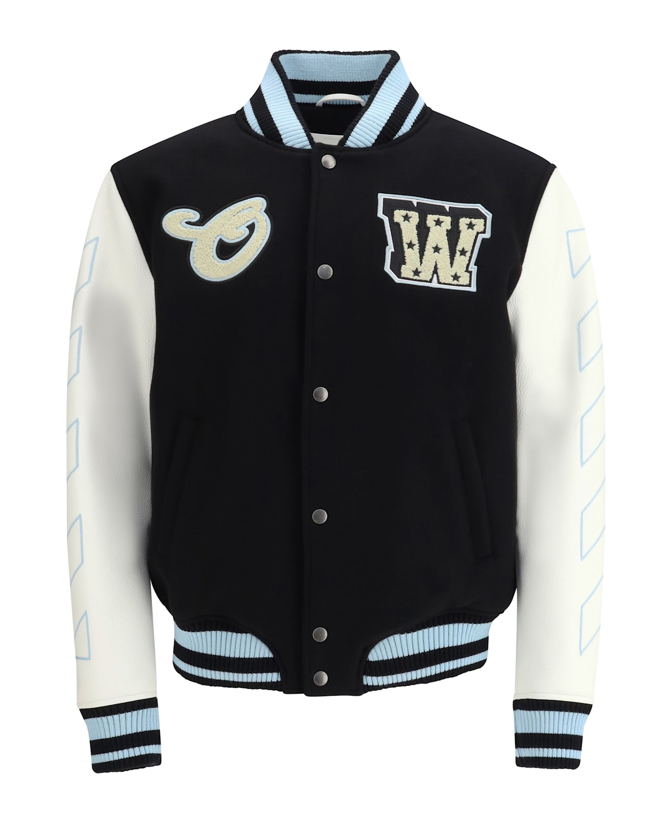 The varsity star logo jacket by off-white is a garment that perfectly blends classic varsity style with contemporary details. made from a combination of leather and wool, this jacket offers a sophisticated look and a comfortable fit. the star logo applied to the sleeves and body of the jacket defines its bold aesthetic, while the use of premium materials ensures quality and durability. a distinctive and modern design, perfect for those looking for a garment that combines sportiness and elegance.