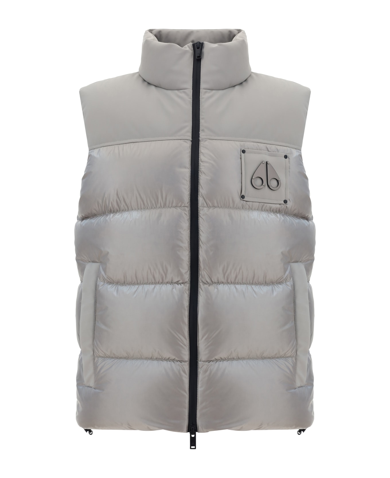 Victory peak padded vest by moose knuckles, front zipper closure, high collar, padded and quilted design, patch with iconic three-dimensional brand logo applique on front, two side welt pockets, elastic ribbed hem. Composition: 100% % Polyamide